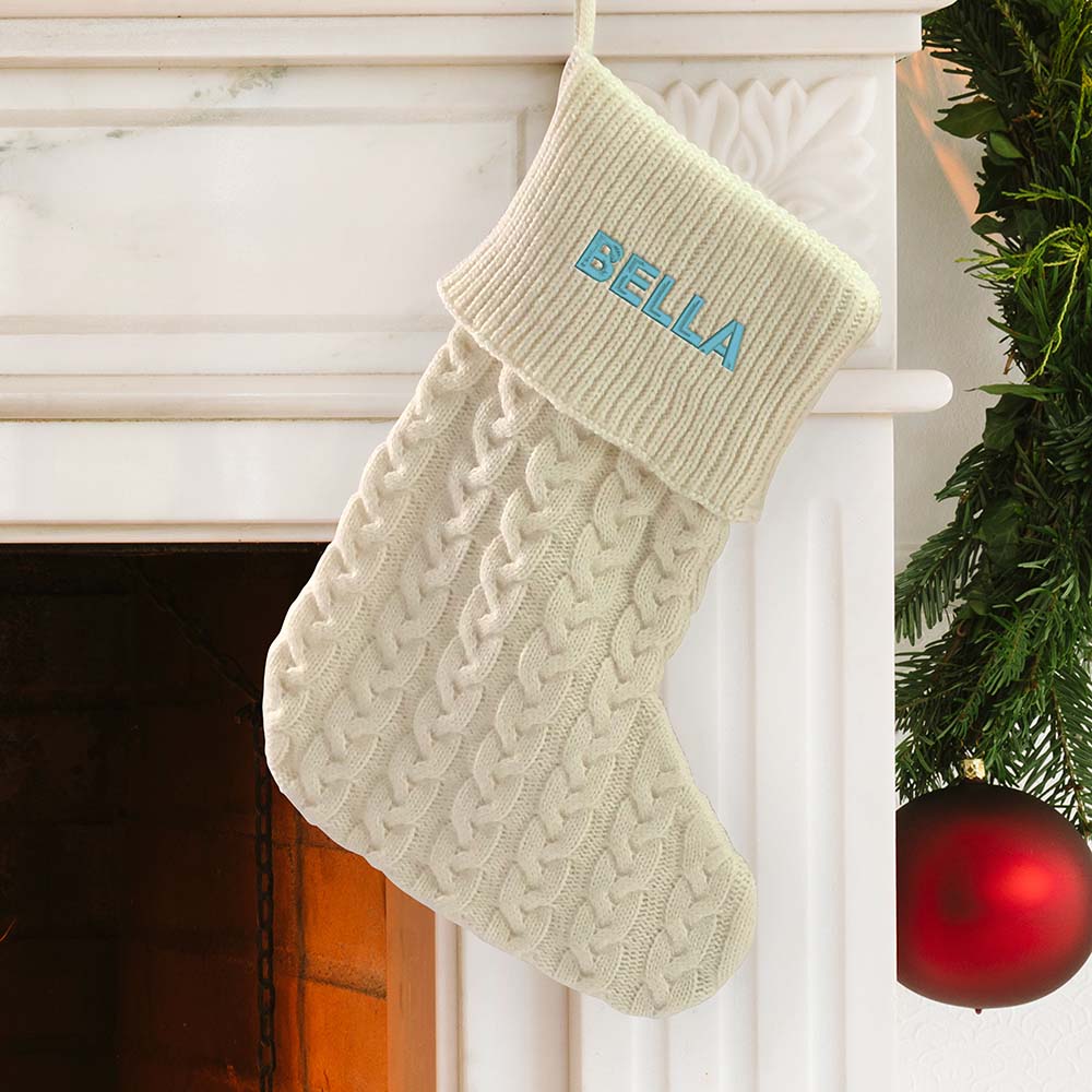 Decorate your mantel or staircase with our Embroidered Gray Cable Knit Stocking to bring festive Christmas joy.