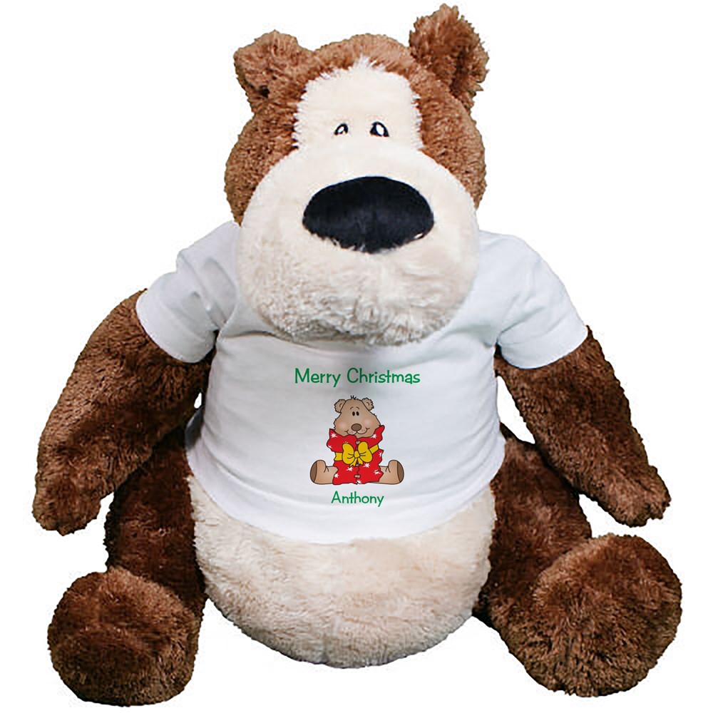 This Holiday Teddy Bear makes a wonderful Christmas Gift for children and adults alike! It is a treasonable keepsake that will be enjoyed year after year.  This festive Christmas design is featured on our Goober Sr. Teddy Bear. Goober Sr. is wearing a t-shirt that features our Teddy Bear Present design. This design can be personalized with any two line custom message to make it a truly special treat! Or, you may change the design to something that better meets your needs. Goober is a unique Gund Bear that's soft and full of his own personality. Goobers a bit pear shaped with a big soft nose and expressive eyes. He has a cute little tail tucked behind him and measures about 22 inches tall. Free personalization is also included.