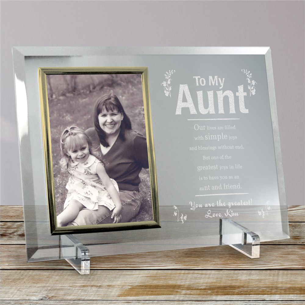 Personalized Beveled Glass Picture Frame for an AuntYour Aunt is someone you can always count on to be there for you. A special shoulder to cry on or tell an all important secret to. Give your favorite Aunt this uniquely Engraved Picture Frame to celebrate the special bond you have developed throughout your life.