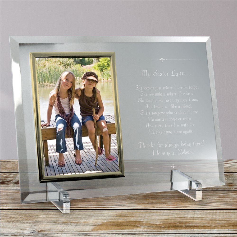 Includes FREE Personalization! Personalize this Beveled Glass Picture Frame with any opening sentiment (ie: My Sister, Lynn) and up to 2 lines of an ending sentiment. (ie: Thanks for always being there!/ I love you, Rebecca)