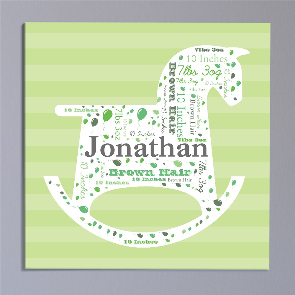 Welcome your new baby girl home when you hang our word art wall canvas in her nursery! These Personalized Baby Gifts For Girls feature her name along with essential details about her birth in one cool, word art rocking horse shape. It's the perfect addition to her nursery decor! Our wall art pieces are great baby gifts for girls.