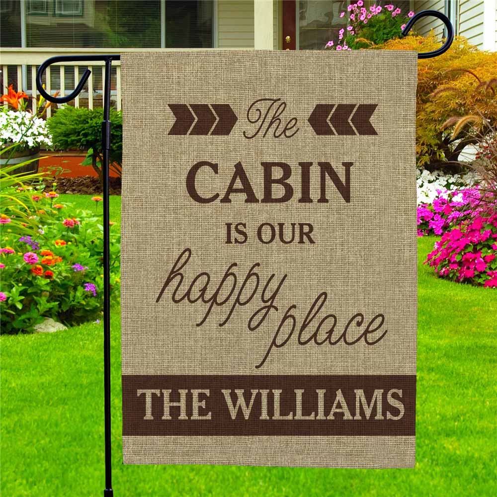 Add a fun touch to your lawn decor with Our Happy Place Personalized Chevron Burlap Garden Flag.