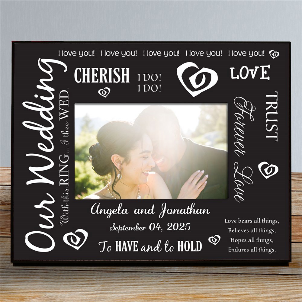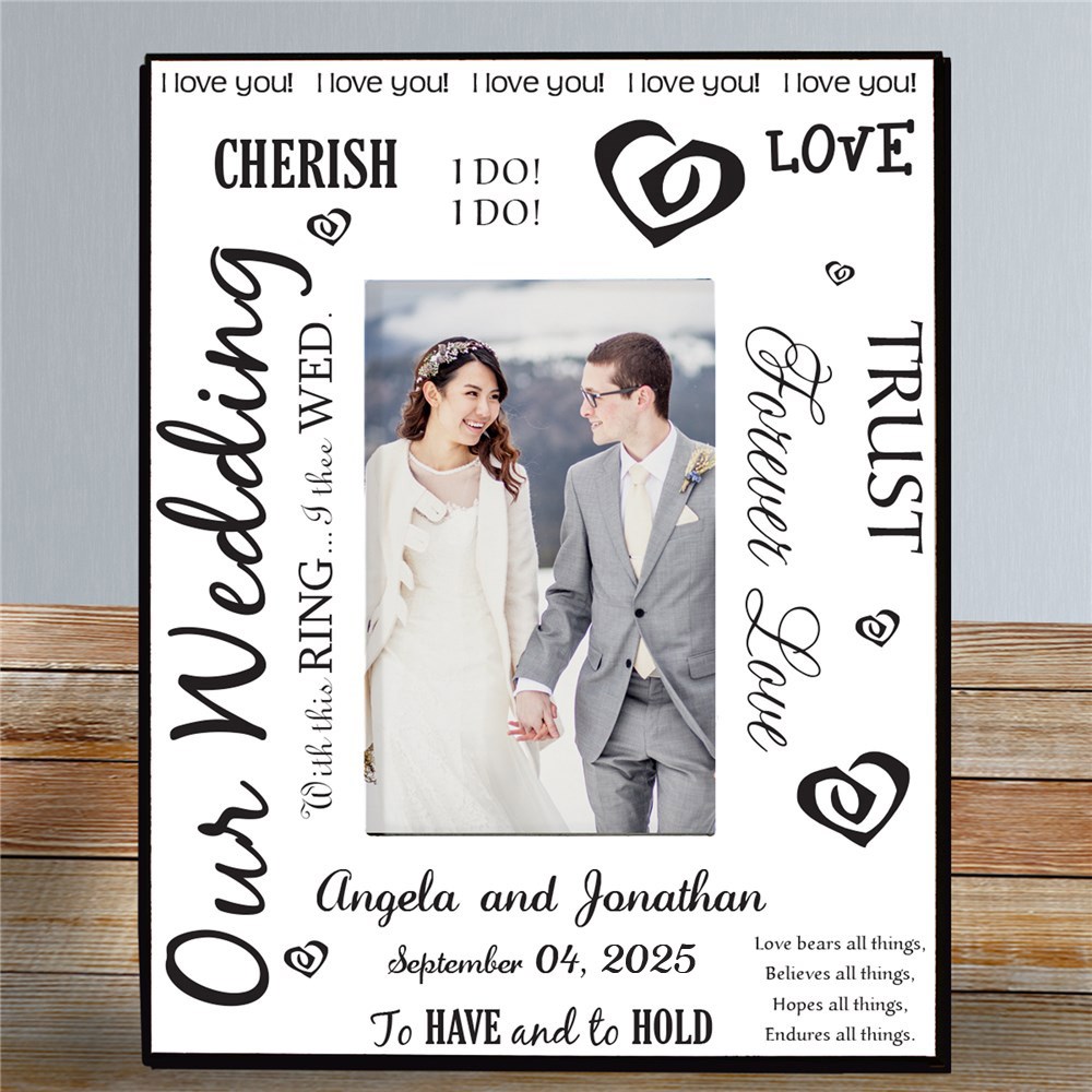 Celebrate your one special day with our personalized wedding picture frames. This customized frame features your names & wedding date for everyone to enjoy, every day. Date will be added underneath names. Please specify background color and orientation.