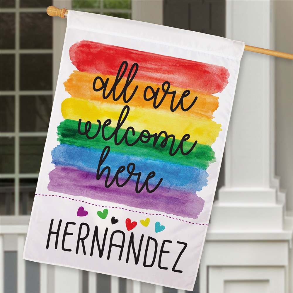 Show that your family supports all forms of love with our Personalized All Are Welcome Here House Flag!