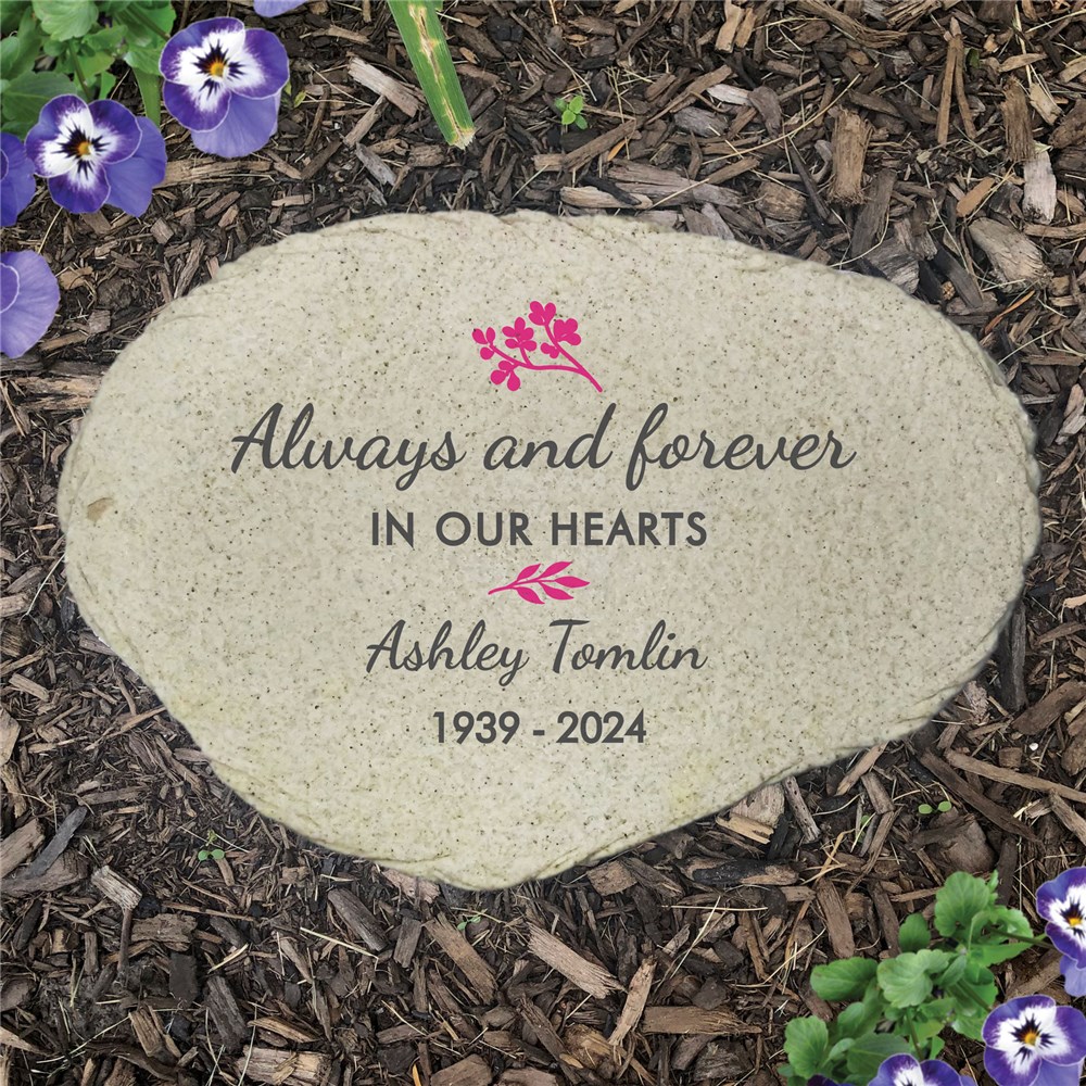 Keep the memory of your loved one alive with this beautiful Personalized Always And Forever In Our Hearts Flat Garden Stone.