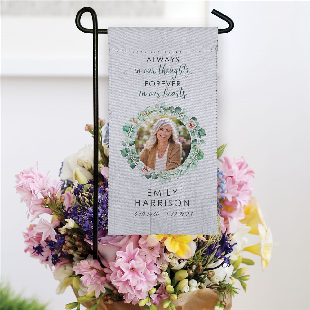 Add our Personalized Always in Our Thoughts Mini Garden Flag to your favorite garden pot, inside or outside of your home.