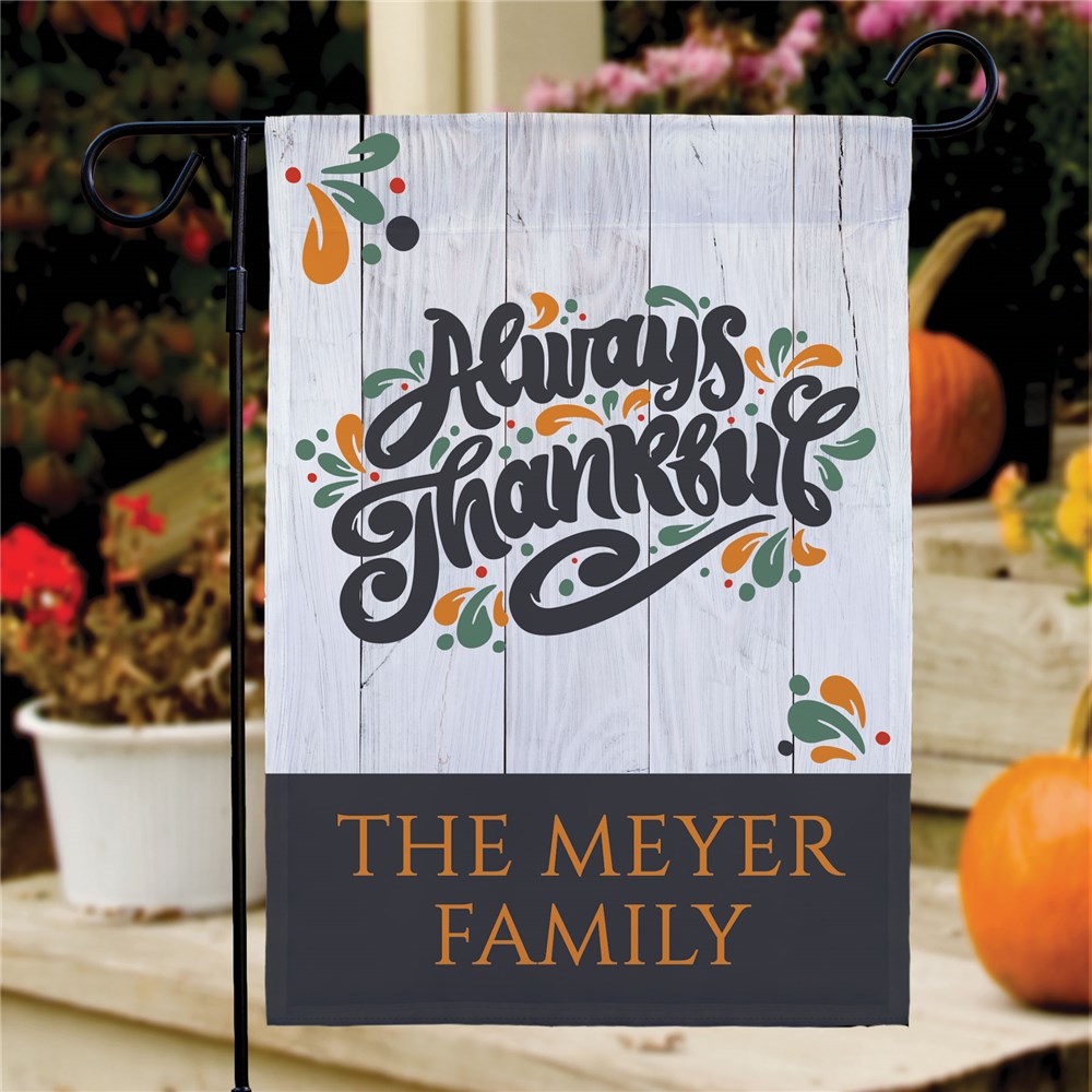 Our Personalized Always Thankful Garden Flag will be very fitting for Thanksgiving decor!