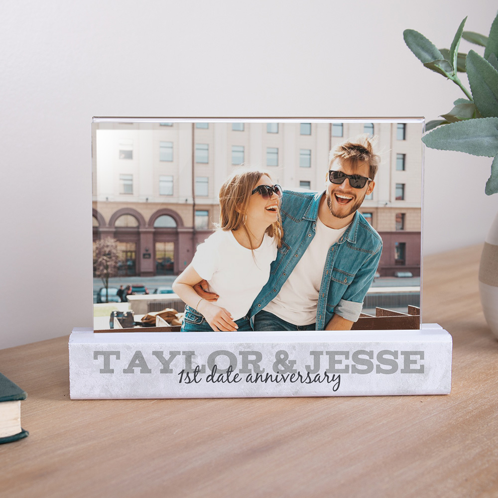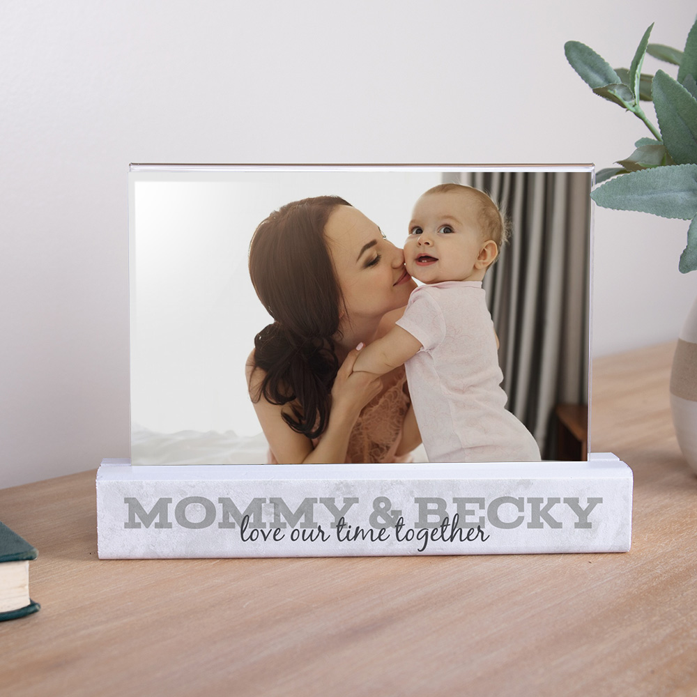 Personalize the base of this photo holder with any 2 custom message lines for a creative alternative to the traditional picture frame.