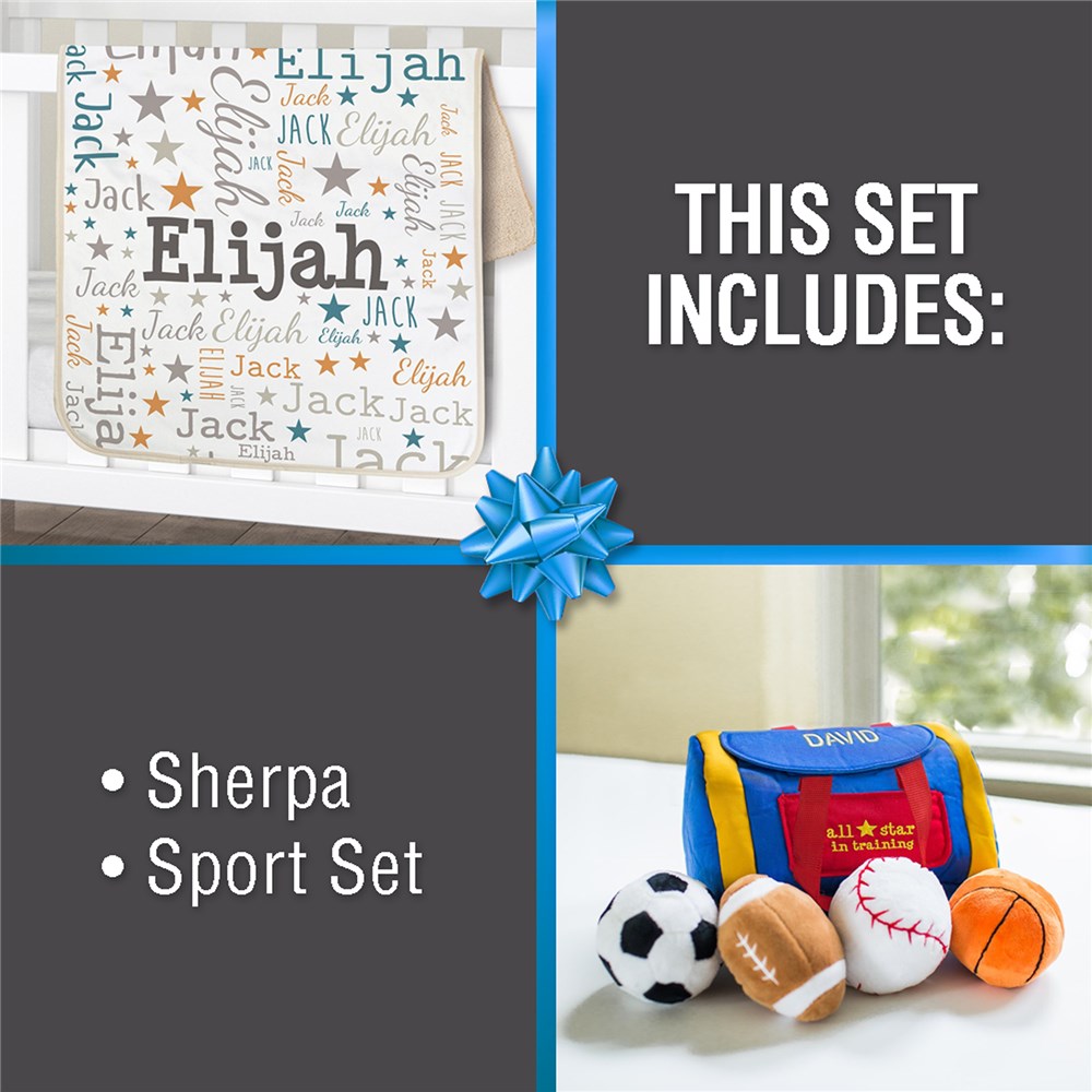 This 2 piece set includes a soft and warm baby blanket as well as a a fun plush sports bag filled with different sports balls.