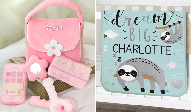 If you’re attending a baby shower, consider our custom onesies as a gift idea. They are practical, cute and a daily reminder of your thoughtfulness. You can also explore customizable gift sets, like our Personalized Baby Girl Gift Set that includes a plush doll, sherpa blanket and photo block, all featuring a monogram of the baby’s name.