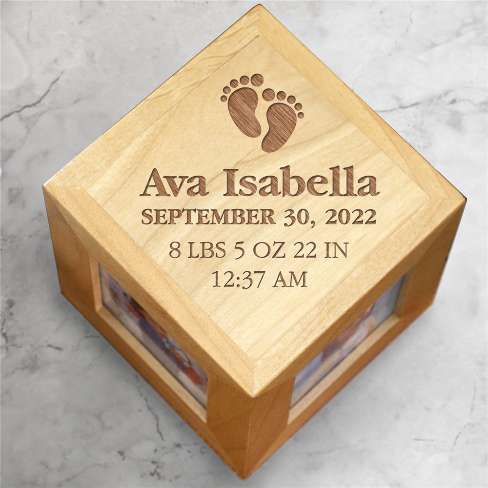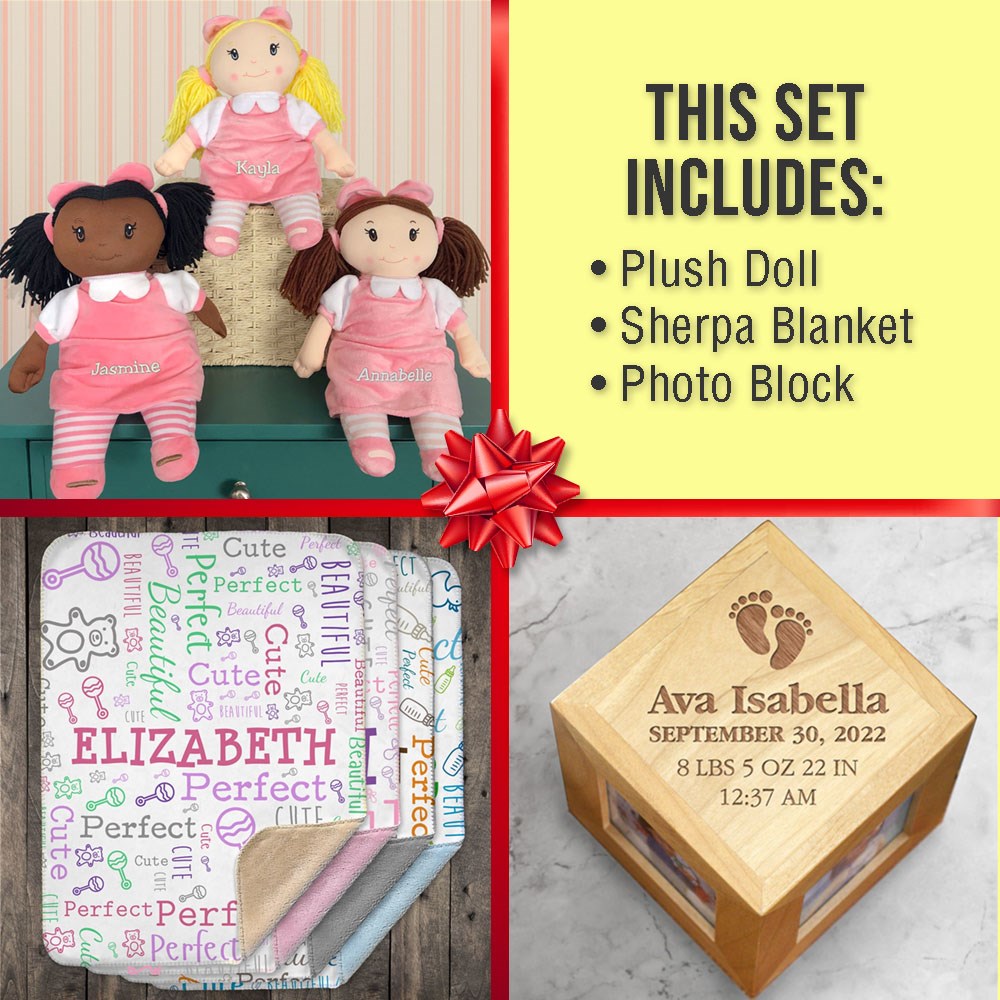 This 3 piece set includes a cute plush dolly, engraved photo cube, and soft sherpa blanket for baby to snuggle with!