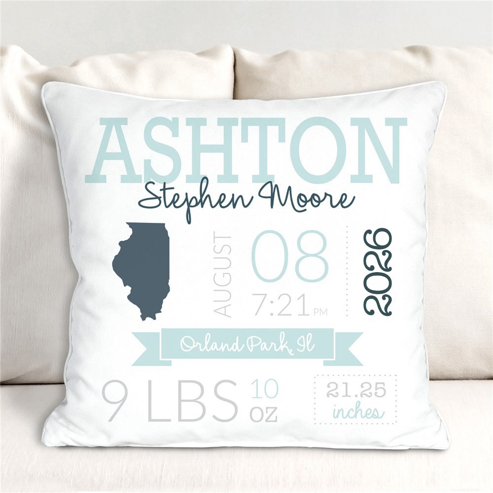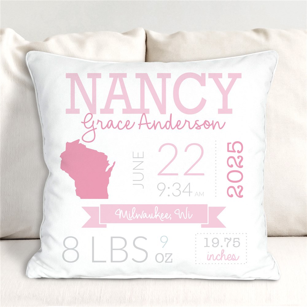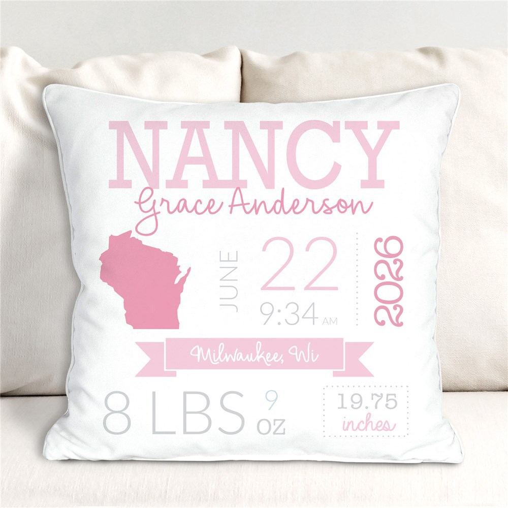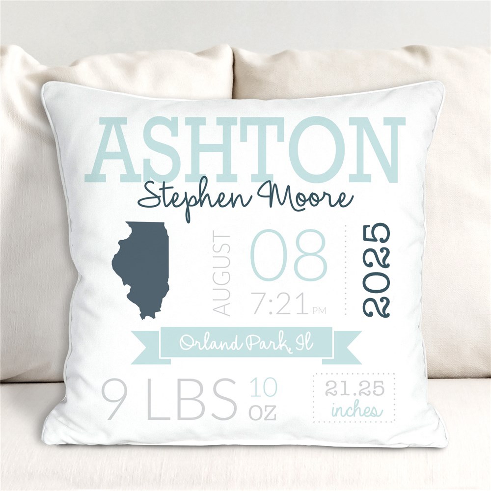 This Personalized Baby State Throw Pillow would make the perfect nursery decoration for your new baby boy or girl! We will custom create this Unique Baby Shower Gift with your choice of design color, first name, middle name/last name, state, month, day, time, am/pm, year, custom message (city and state shown), pounds, ounces, and inches. This is a decorative piece that your family can keep for years to come as a reminder of your new bundle of joy!