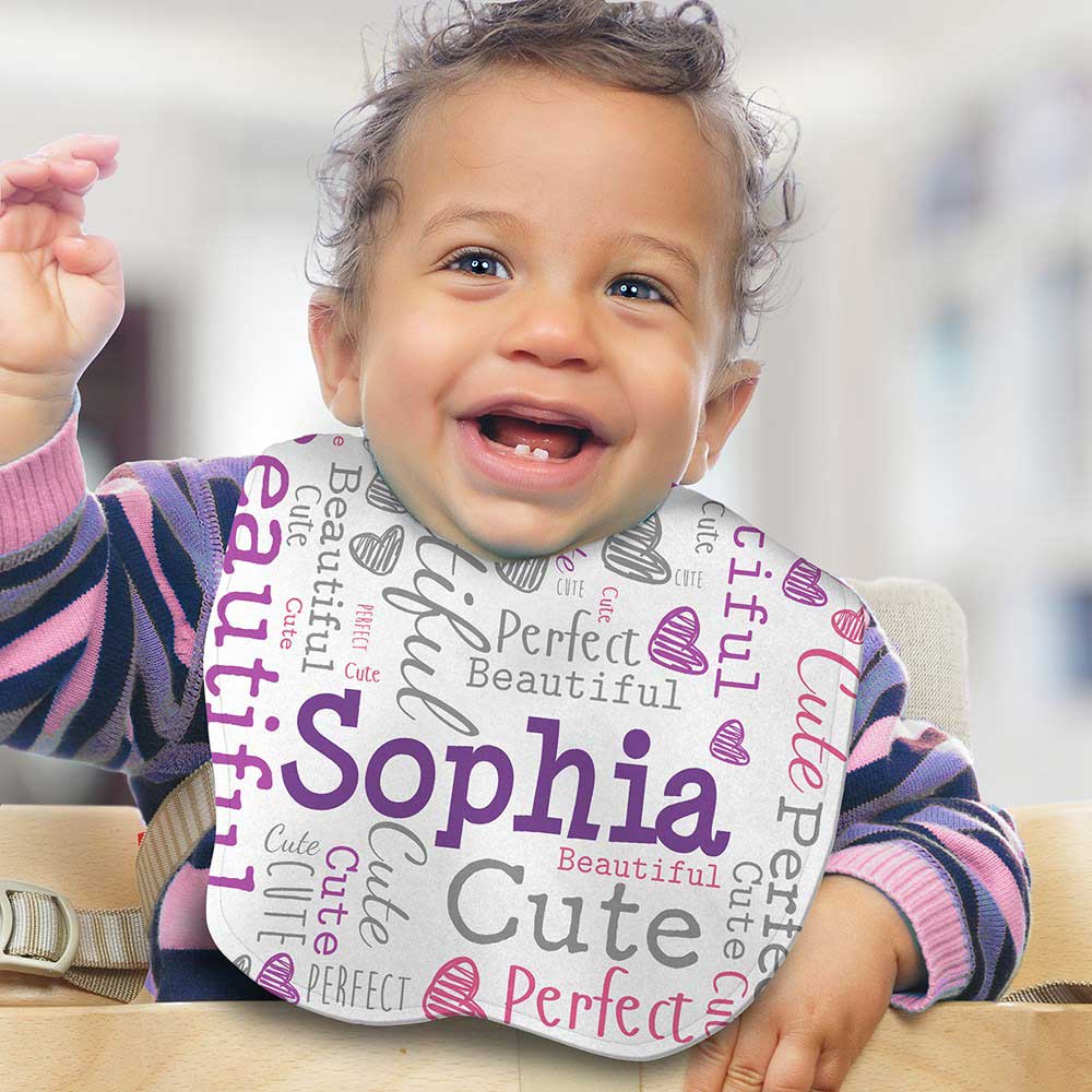 Our Personalized Baby Word Art Baby Bib will keep your baby's clothes clean while eating.