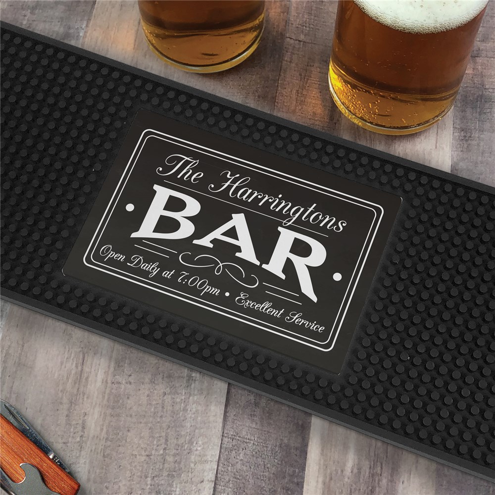 Make your home bar the go-to spot with this Personalized Bar Open Daily Bar Mat. Featuring your family name and custom “Open Daily” details, this durable mat adds personality and function to your entertaining space.