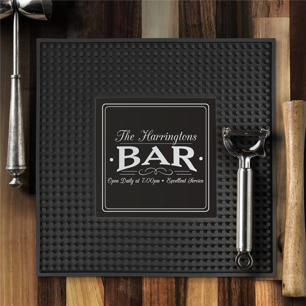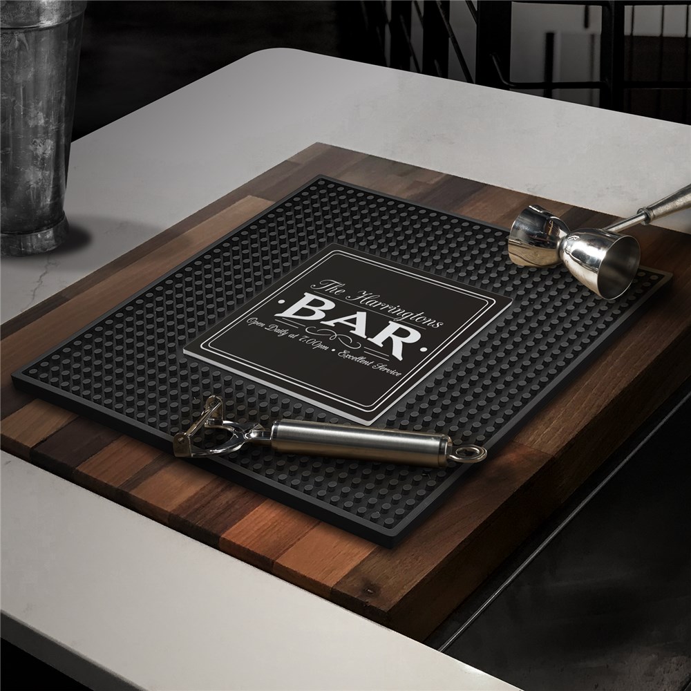 Make your bar the neighborhood favorite with this Personalized Bar Open Daily Square Bar Mat. Customized with your family name and the time your bar “opens,” this fun design makes a unique gift for hosts and entertainers.