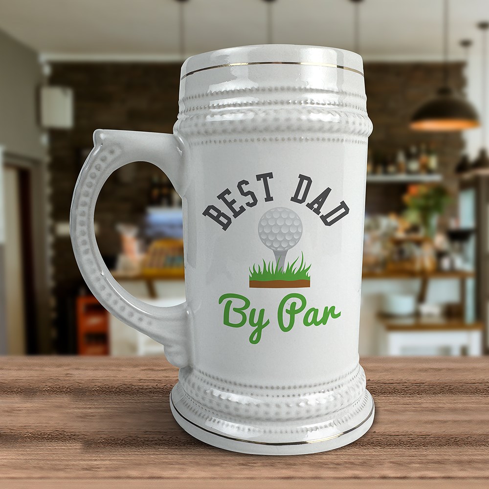 Celebrate your favorite golfer with this classic Personalized Best By Par German Beer Stein, perfect for birthdays, Father's Day, or any special occasion. The front features a playful golf design and the phrase "By Par", with room to customize the title above—add “Best Dad,” “Best Daddy,” or any title up to 12 characters to make it uniquely theirs!