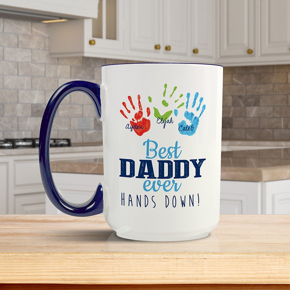 Celebrate Dad in the most heartwarming way with this Personalized Best Ever Hands Down Two Tone Blue Handle Mug! Featuring the phrase "Best *Title* Ever – Hands Down!" and the option to personalize with any title and up to 4 names, this gift is perfect for Father’s Day, birthdays, or just because. It's a practical and personal keepsake from the kids that Dad will love to use every day.