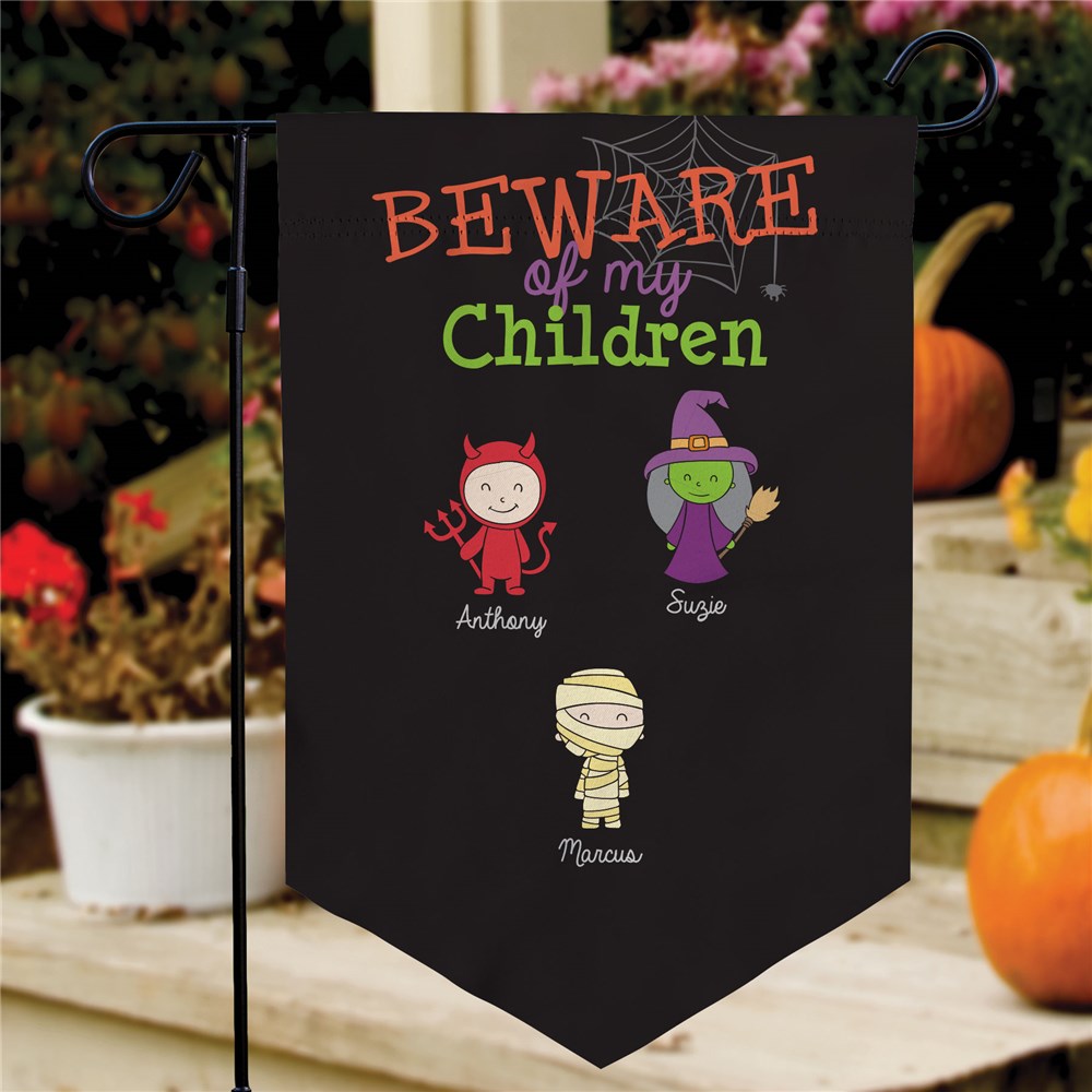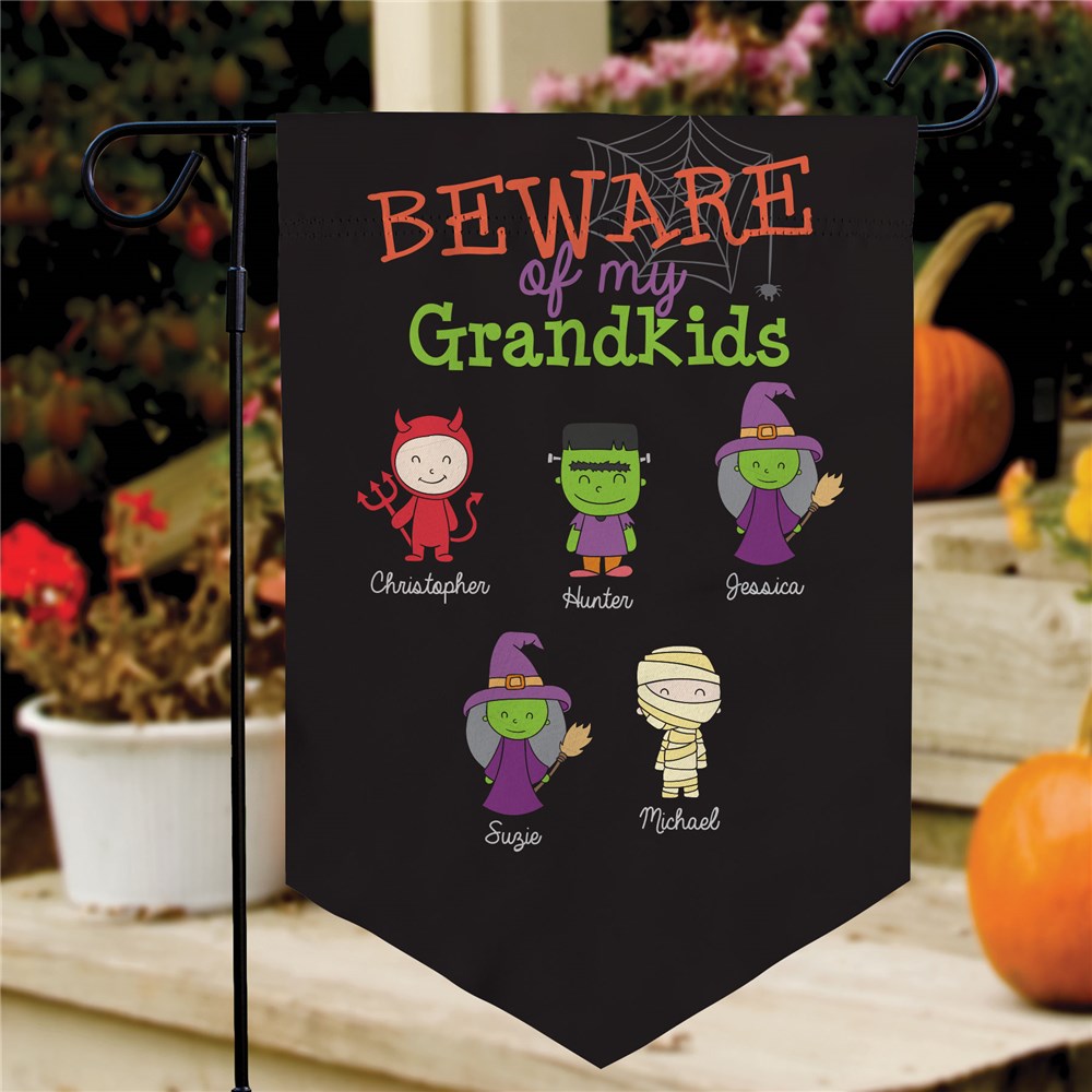 Bring your Halloween decor to the next level with our Personalized Beware of My Grandkids Pennant Garden Flag!