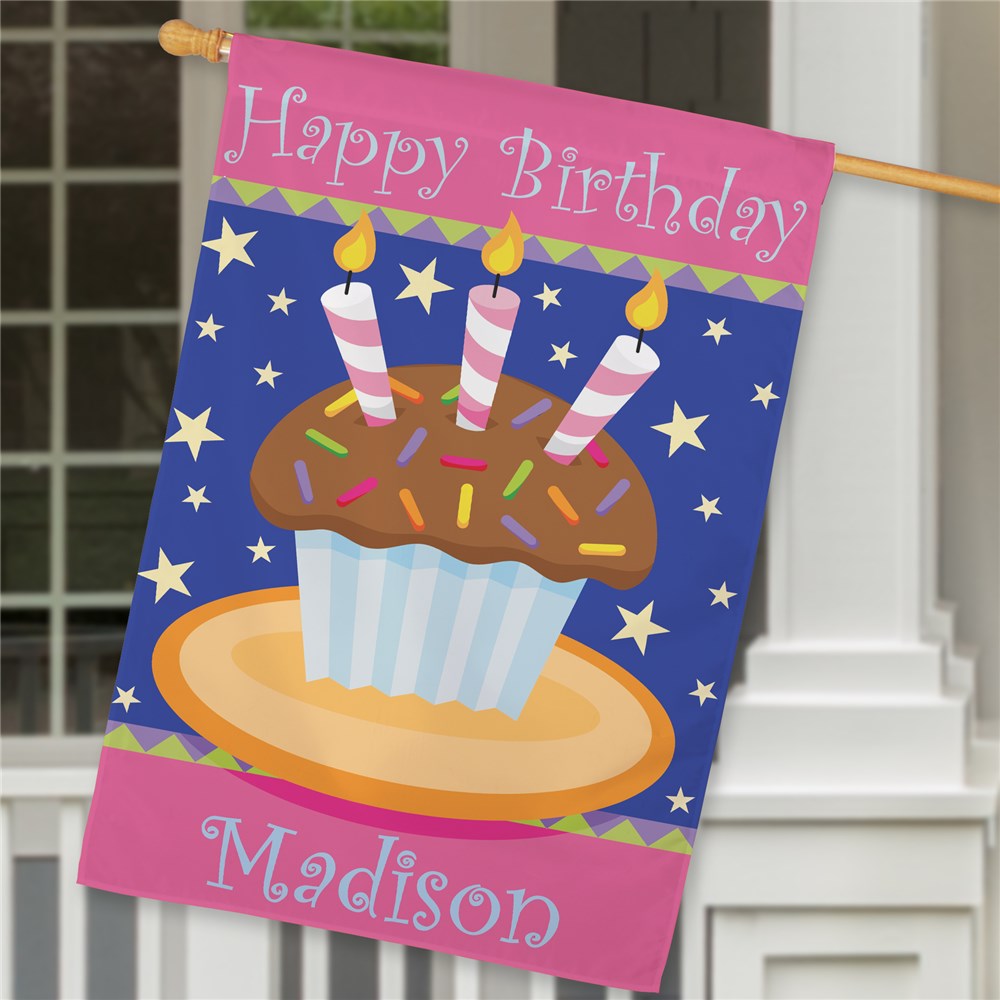 Announce a birthday the fun way by displaying these Happy Birthday Personalized House Flags for all to see. Decorative House Flags for birthdays show exactly whose birthday it is and where the party is at. Personalize your flag with any name.