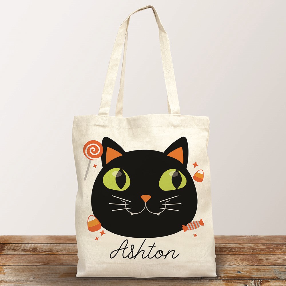 Personalized Black Cat Trick Or Treat Tote Bag