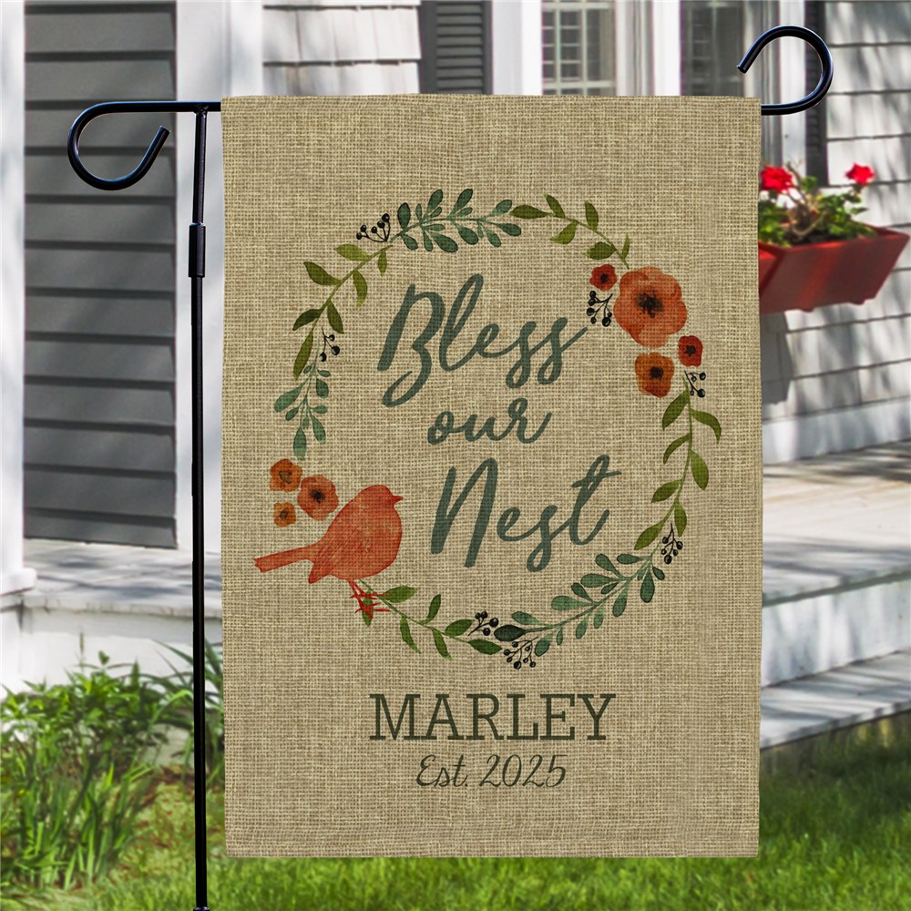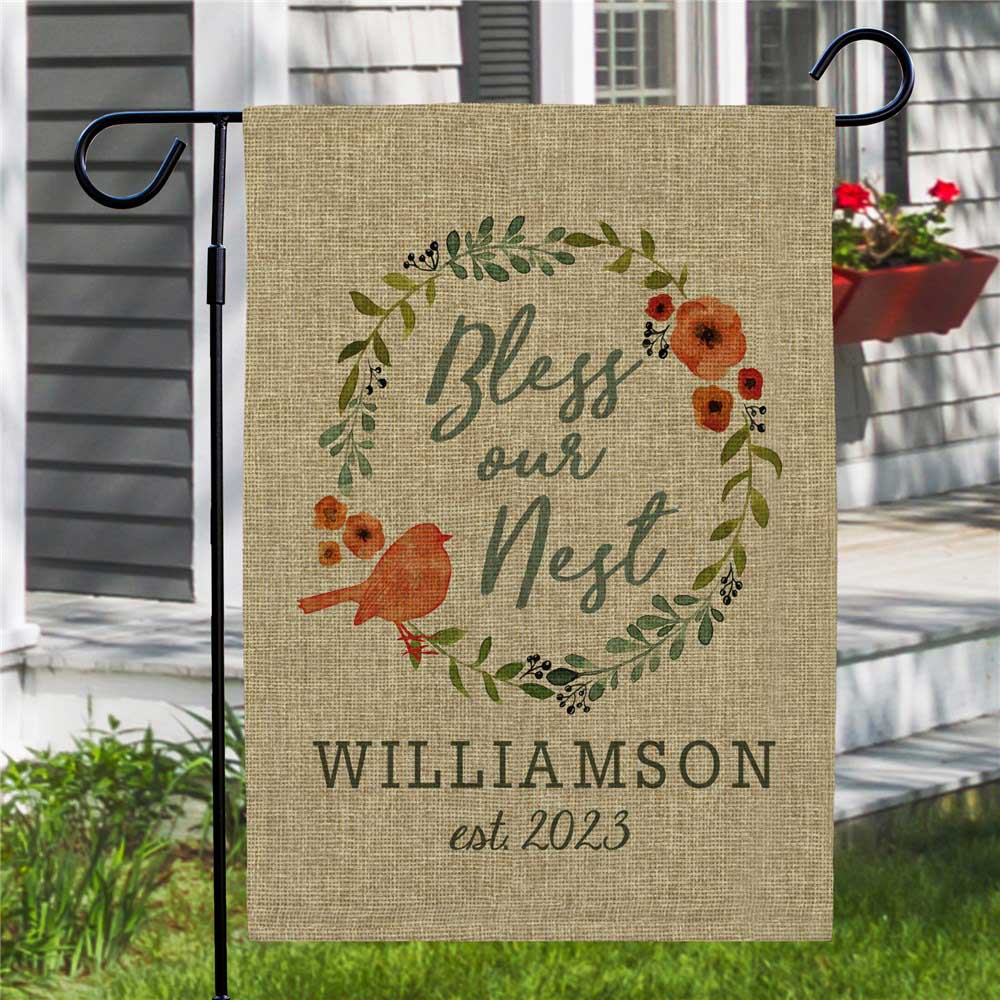 Add a beautiful design and message to your front yard with a Personalized Bless Our Nest Burlap Garden Flag. We will custom create this design with any family name and year established to make a special welcome to all family and friends. Give as an Easter, spring, or personalized housewarming gift! This design is great year round.