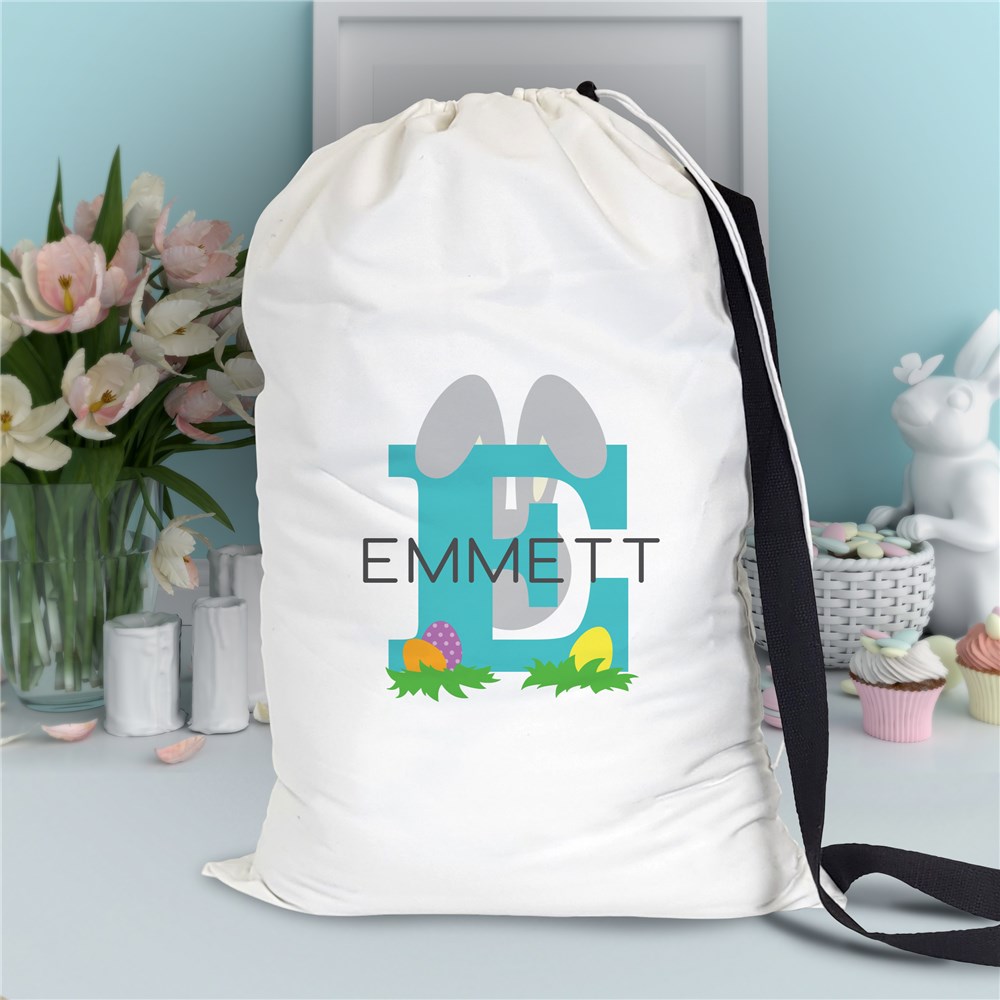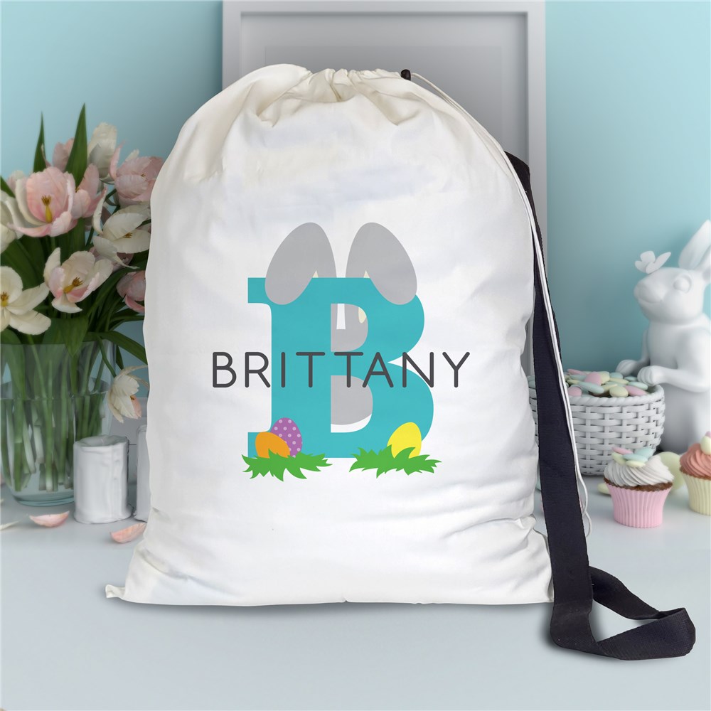 This Personalized Bunny Ear Initial And Name Easter Gift Sack is perfect for egg hunts, Easter treats, and special surprises from the Easter Bunny.