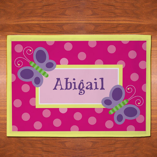 Butterfly Placemat - Personalized Butterfly Placemat for HerThis bright and colorful Butterfly Placemat is sure to make her meal & activity time extra fun. Make it an excellent gift idea for any occasion. Your Butterfly Place Mat measures 12.5” x 18” and features smooth, white 100% poly top and black 100% cotton back. Easily washes with cold water and mild soap. Do not machine wash. Free personalization of any name is included.