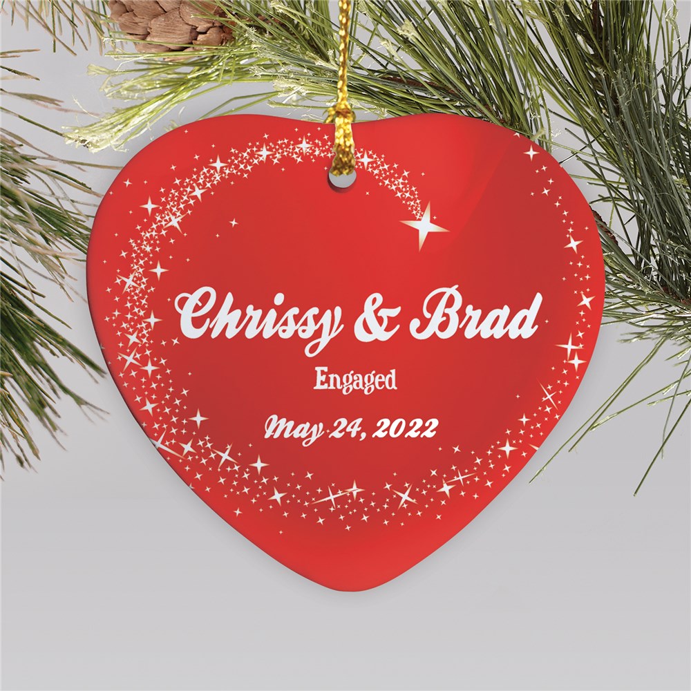 Congratulate your newly engaged couple by presenting them with this beautiful heart shaped Engagement Christmas Ornament. Our Personalized Ornament is a keepsake they can hang anywhere they please and looks fabulous hung on the Christmas tree every year.