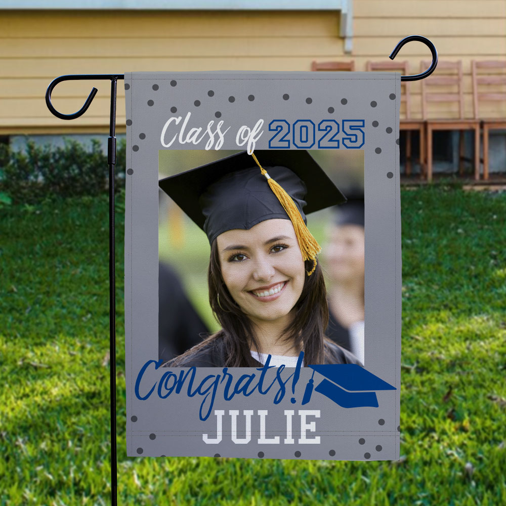 Add a great decor piece to your lawn for their graduation party with our Personalized Class Of With Confetti Graduation Garden Flag.