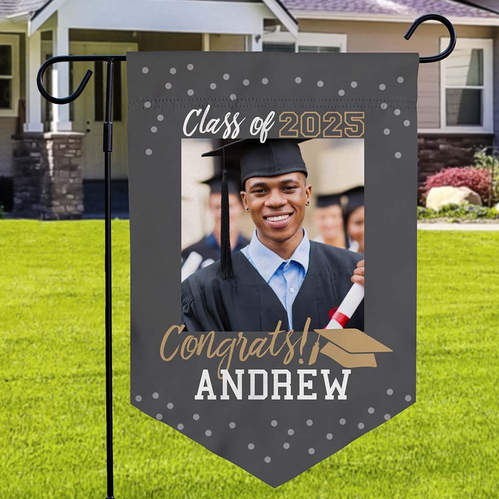Add a great decor piece to your yard for their graduation party with our Personalized Class Of With Confetti Graduation Pennant Garden Flag.