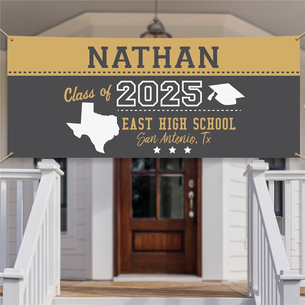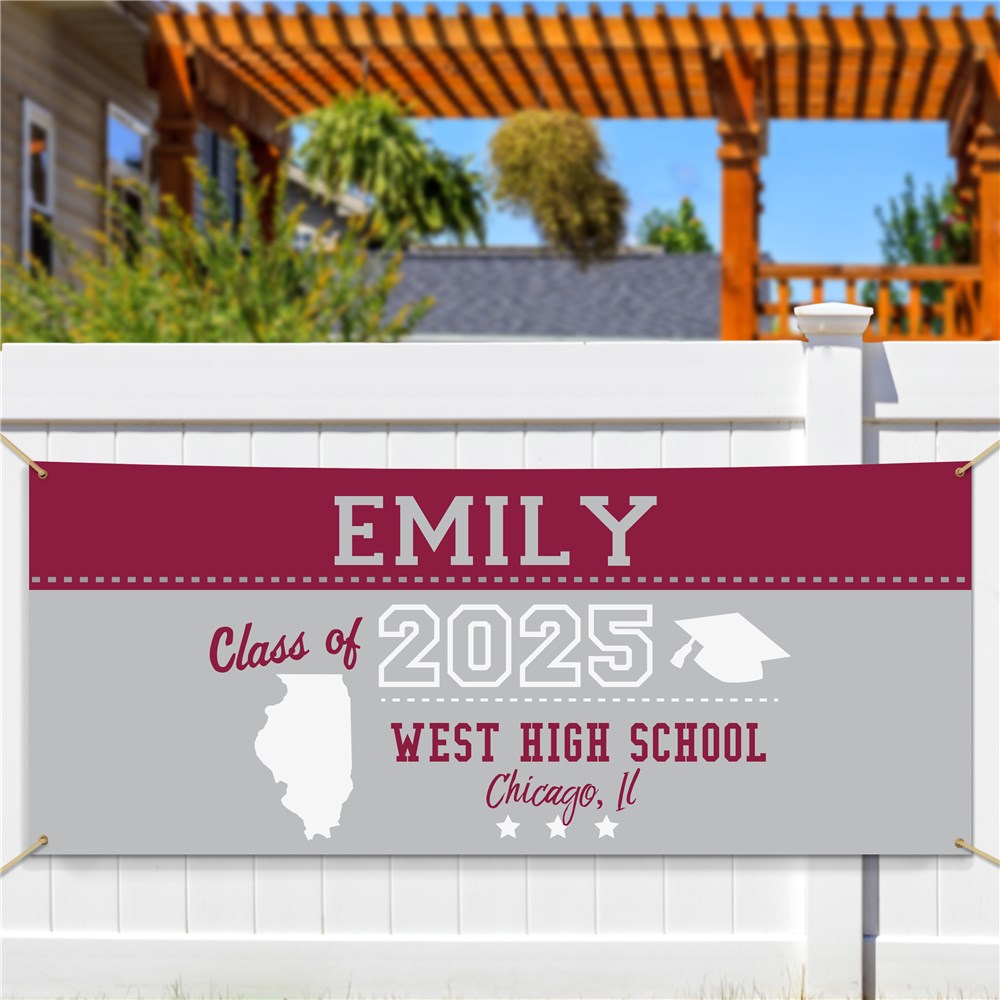 This banner may be personalized with their name, the year, any state, and any two custom message lines in your choice of design colors.