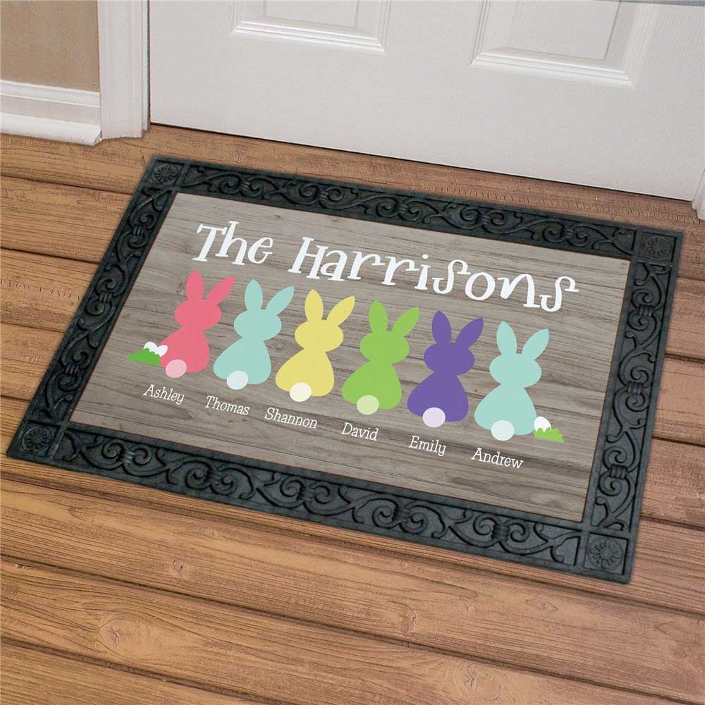 Personalized free, this doormat is customized with your name or message and up to 6 bunny shapes for your family members.