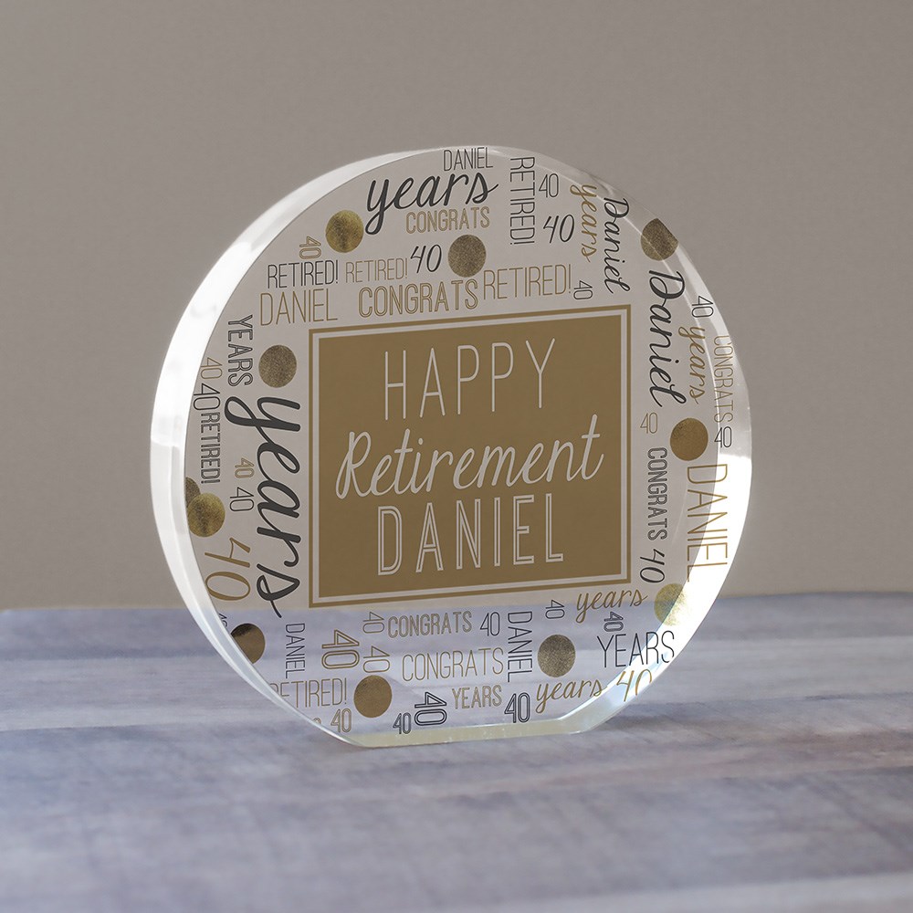 Any retiree will be proud to display our Personalized Confetti Retirement Word Art Round Acrylic Keepsake!