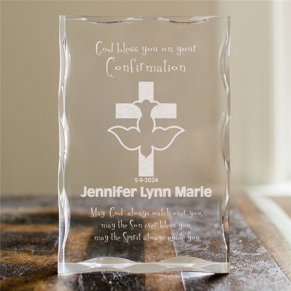 Treasure the day your son or daughter officially becomes an adult in the Catholic Church with this beautifully engraved confirmation keepsake. This custom Confirmation keepsake reads; God bless you on your Confirmation and will be personalized with any name (up to 30 characters) and date.