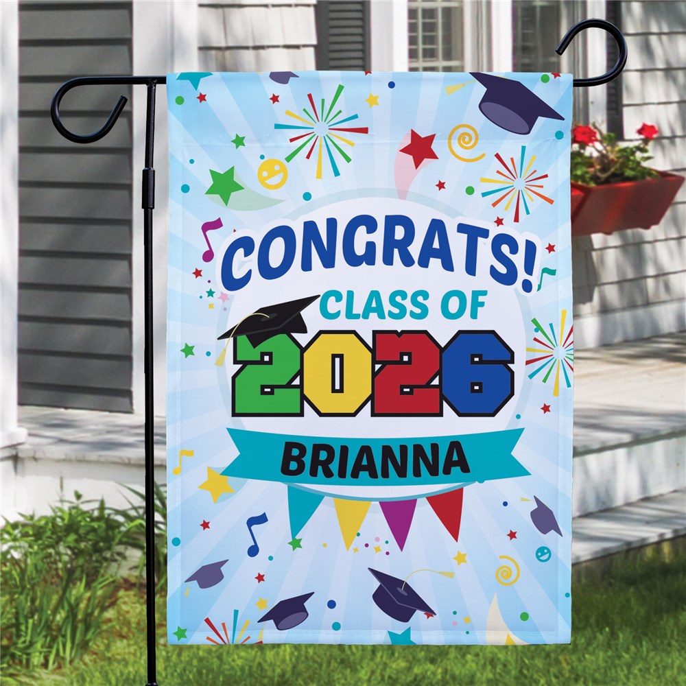 Graduation day is finally here and you are ready to celebrate with our Congrats Fireworks Personalized Garden Flag displayed in your lawn! Our Custom Garden Flags may be personalized with any year and any name. These custom flags make for great personalized graduation gifts and graduation party decorations!