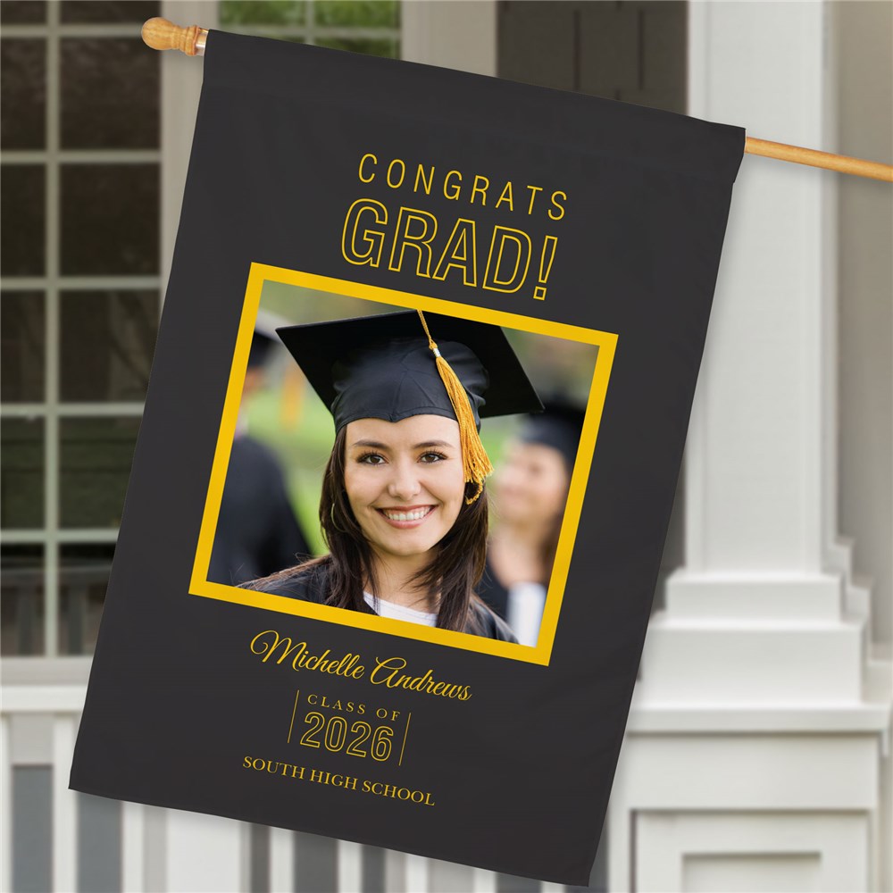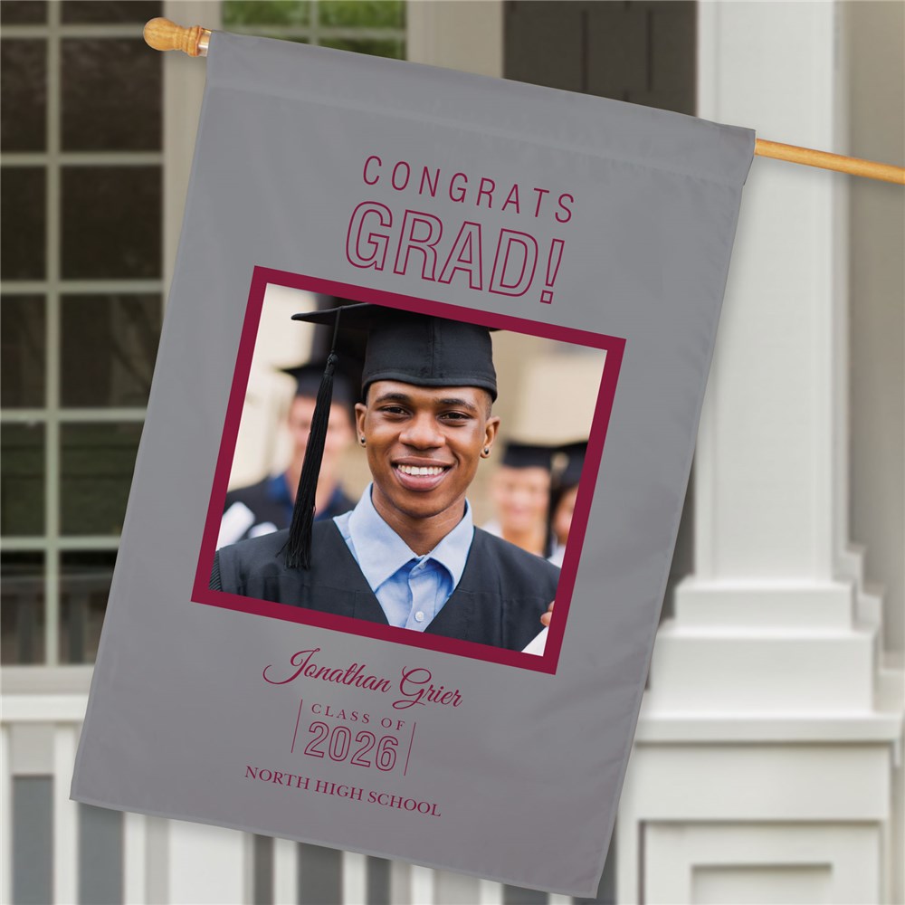 Hang our Personalized Congrats Grad Photo House Flag to congratulate your grad on a job well done.