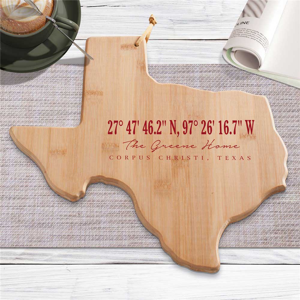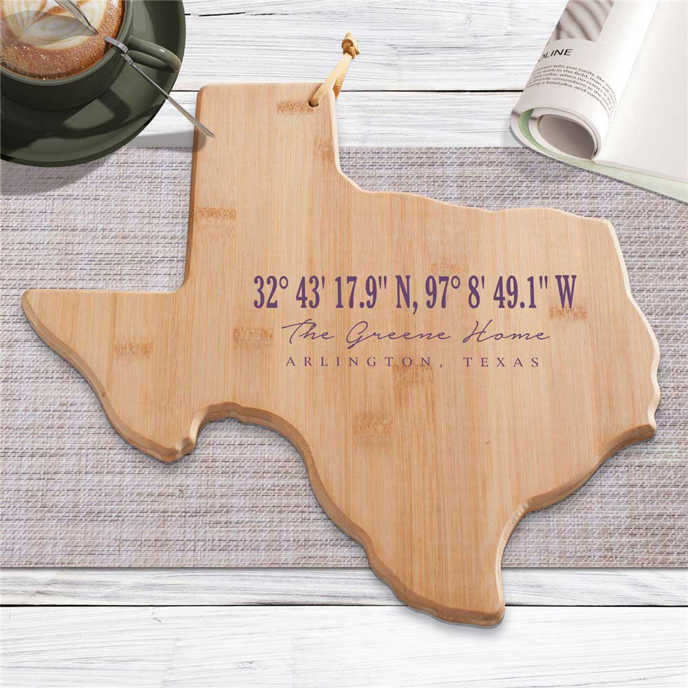Show your love for your favorite state our Personalized Coordinates Texas Cutting Board!