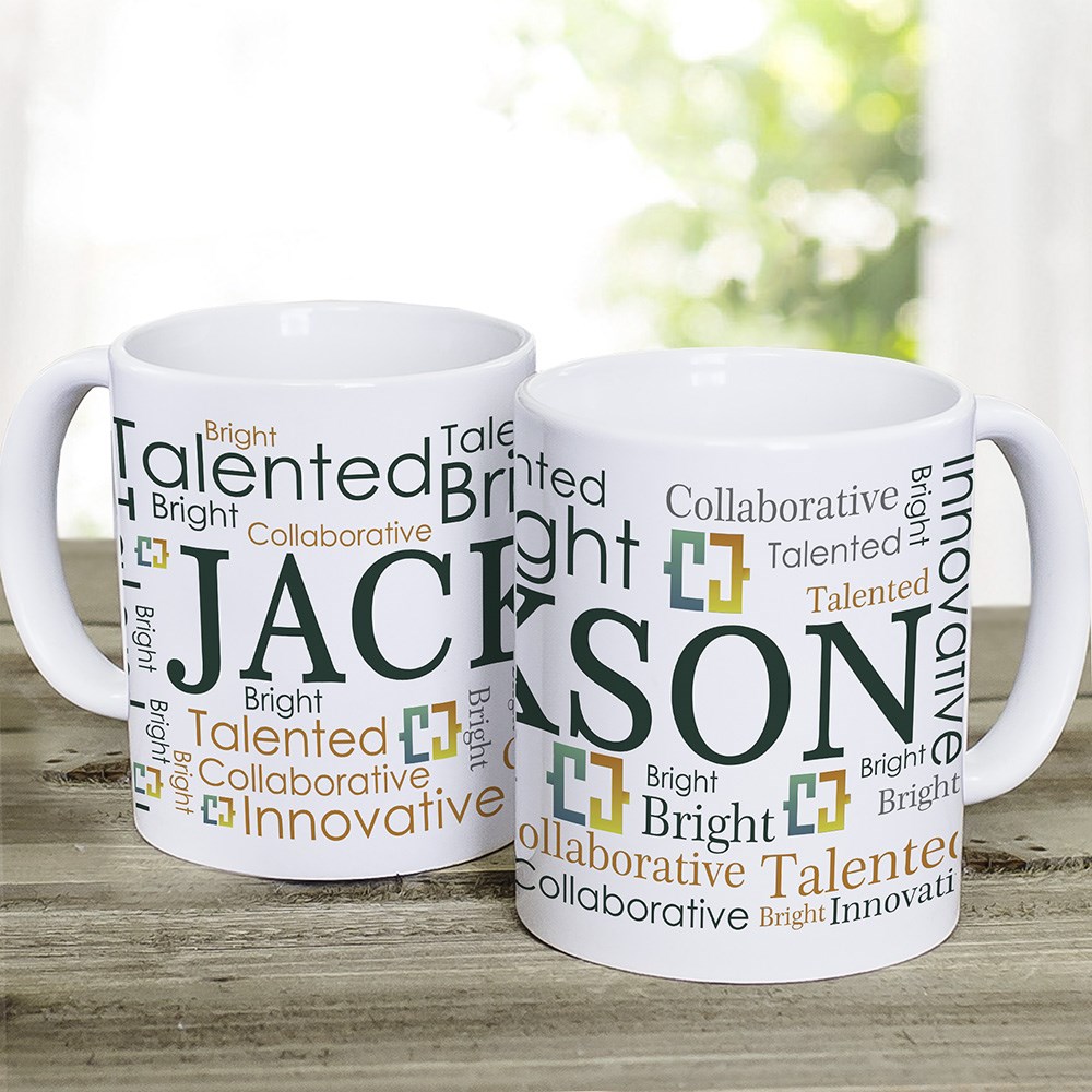 Employees can start their day off right with our Personalized Corporate Name Word Art Coffee Mug. Use our word art tool to personalize with any name, all of their best qualities, and an image of your logo.