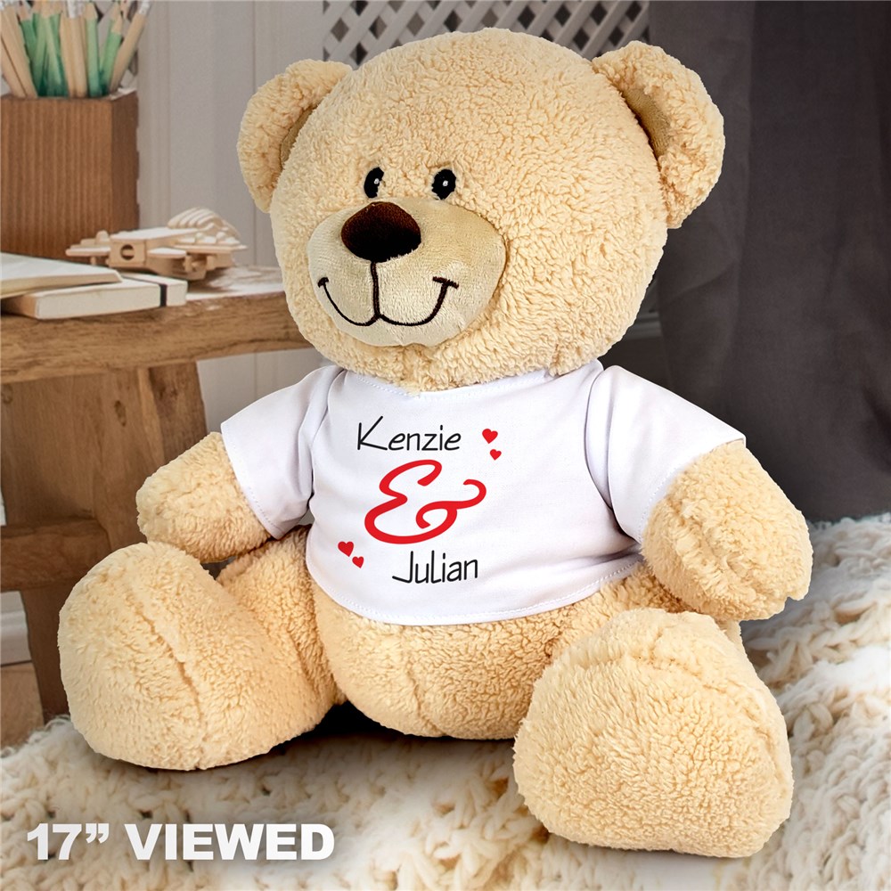 You're guaranteed a bear hug when you present your loved one with this custom couple's teddy bear, whose shirt will be personalized with any two names (up to 12 letters each). This adorable custom Personalized Valentine's Bear is wonderfully soft and features an irresistible look on his face and contrasting tan fur on the inside of his ears and snout.