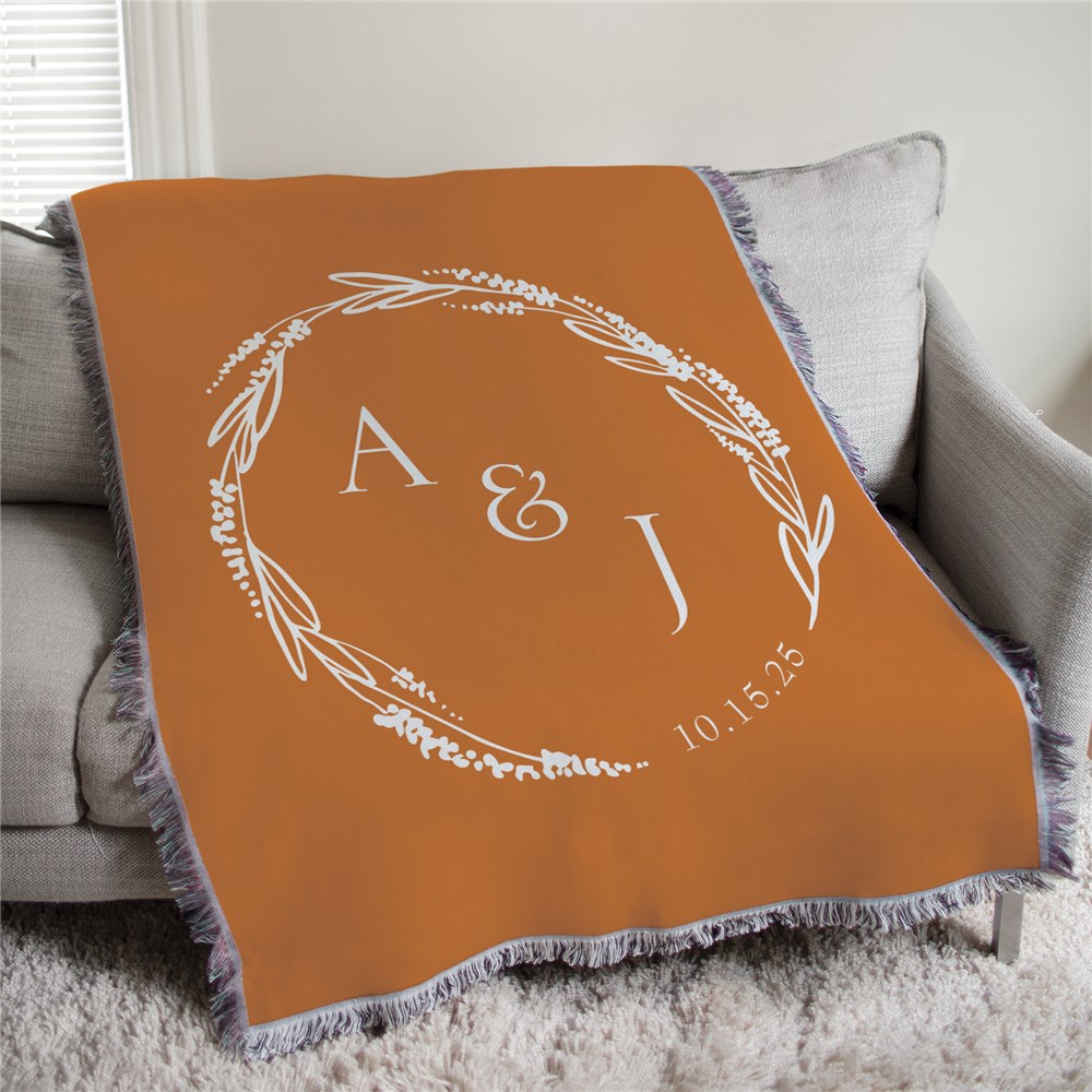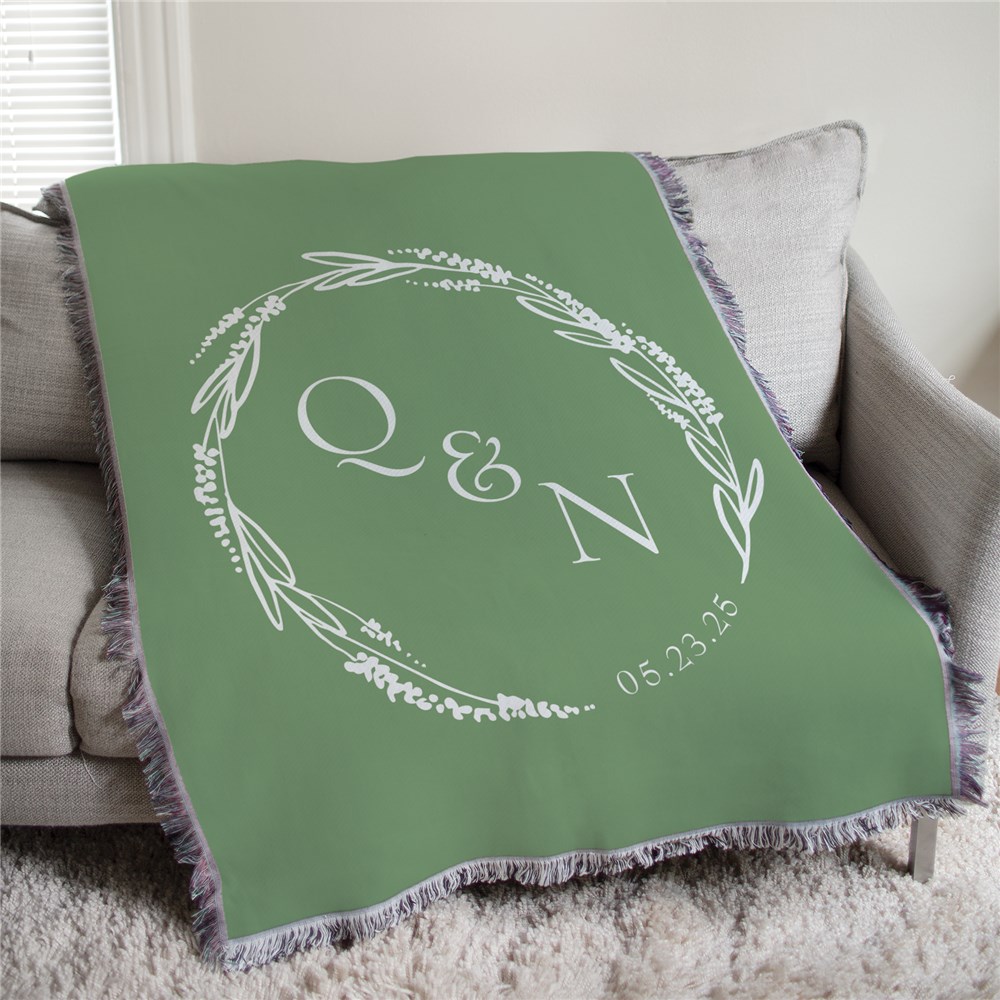 Featuring a charming botanical wreath design, this blanket is customized with your color choice, chosen initials and a meaningful date, perfect for weddings, anniversaries, or a special gift for the couple who has everything.