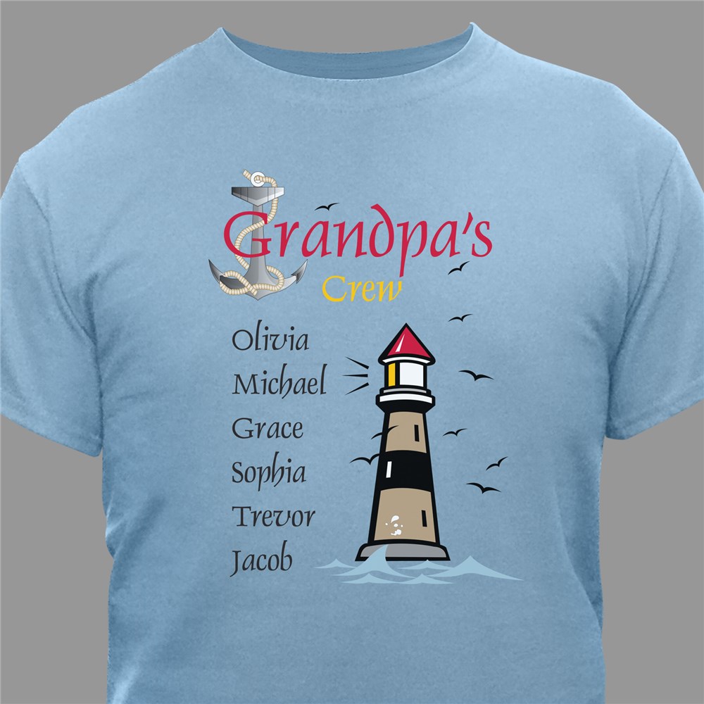 He loves the water, and he'll love one fot these lighthouse personalized T-Shirts. Your custom crew shirt can be personalized with any title up to 16 letters (Dad, Poppy, Uncle, etc.) and up to 30 loved ones' names! This great Personalized Shirt featuring a lighthouse comes in river blue and is made of 100% preshrunk cotton. It's machine washable and available in adult sizes S-3XL.