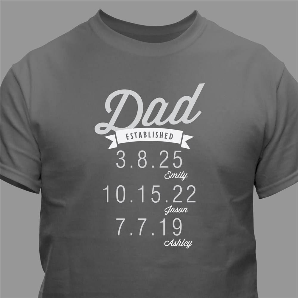 He'll never forget the dates his little ones were born when he wears this Personalized Dad Established T-Shirt! The day he became a Dad, Grandpa or even an uncle will be personalized for all to see when he proudly wears one of our unique Dad shirts. We'll custom print any title and up to 6 dates and names. Please enter a period (.) in between the month, day and year of the date for a better appearance. (ex. 12.20.04) Please Note: The word Established is standard on the this shirt. We recommend entering the child's name in lowercase for best presentation.