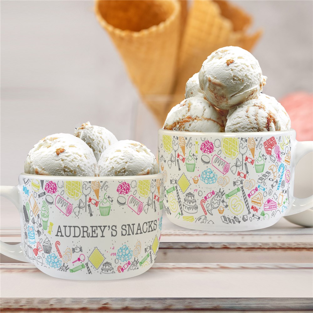 Enjoy your favorite sweet snack even more with our Personalized Dessert Icon Background Bowl with Handle!This bowl, perfect for ice cream or other tasty desserts can be personalized with any custom message line.