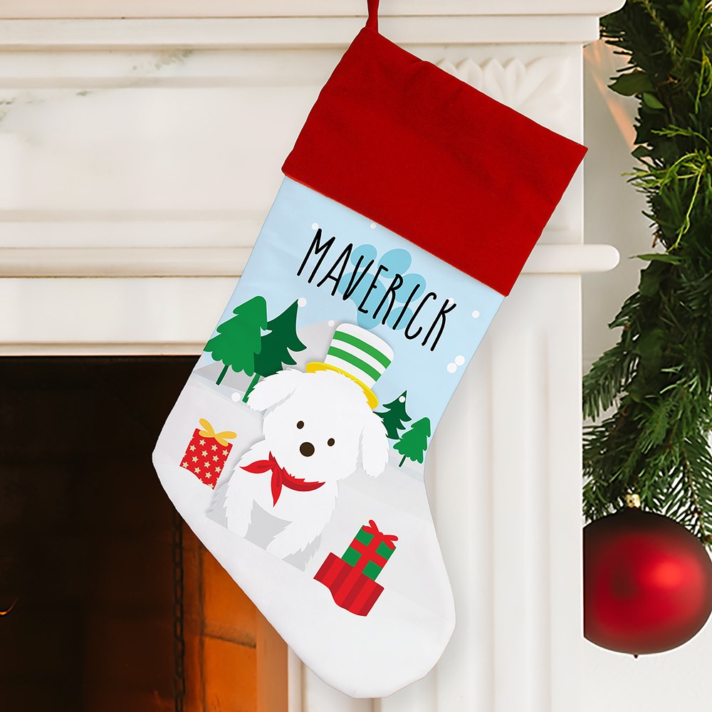 This festive stocking is fully customizable—select your dog's breed and add their name for a personal touch.