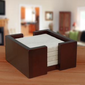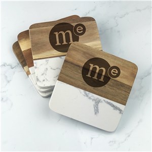 .Engraved Initial Leaves Marble & Acacia Coasters