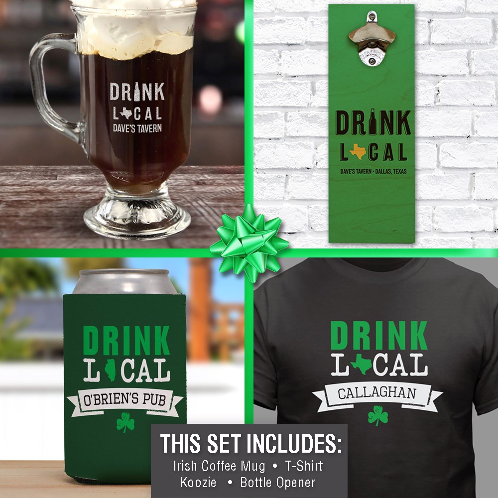 Promote your local bar for St. Patrick's Day with our Personalized Drink Local St. Patrick's Day Gift Set!