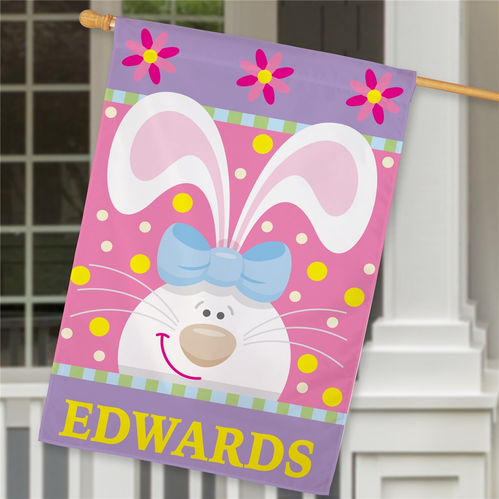Whether you are celebrating Easter or you just love bunnies, this bright, cheerful personalized house flag instantly will add curb appeal to your home. Your custom Easter bunny welcome flag comes customized with any one-line name or message (up to 20 characters) to make this one-of-a-kind Personalized Easter Decor.