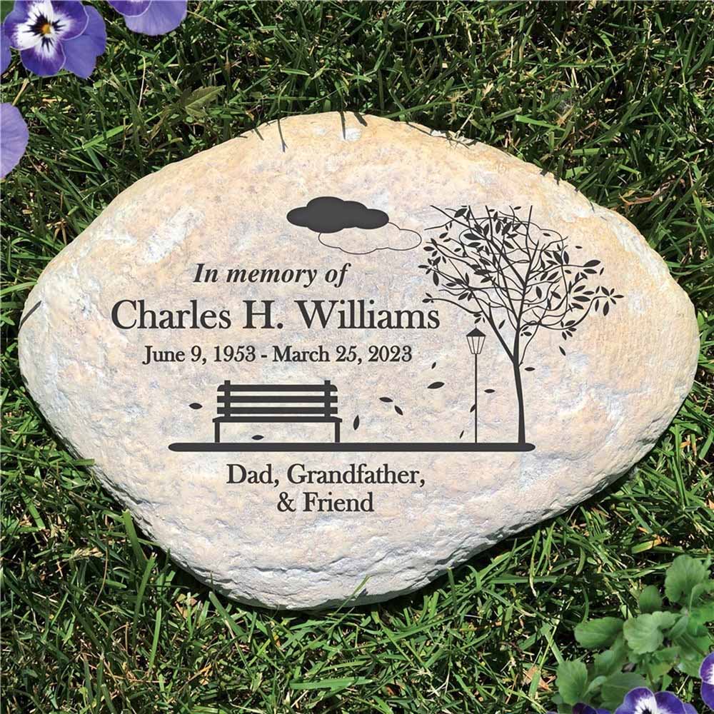 Personalized Empty Bench Memorial Garden StoneWe custom personalize these Personalized Memorial Stones with any name, memorial date and 2 custom message lines. Remember someone special.