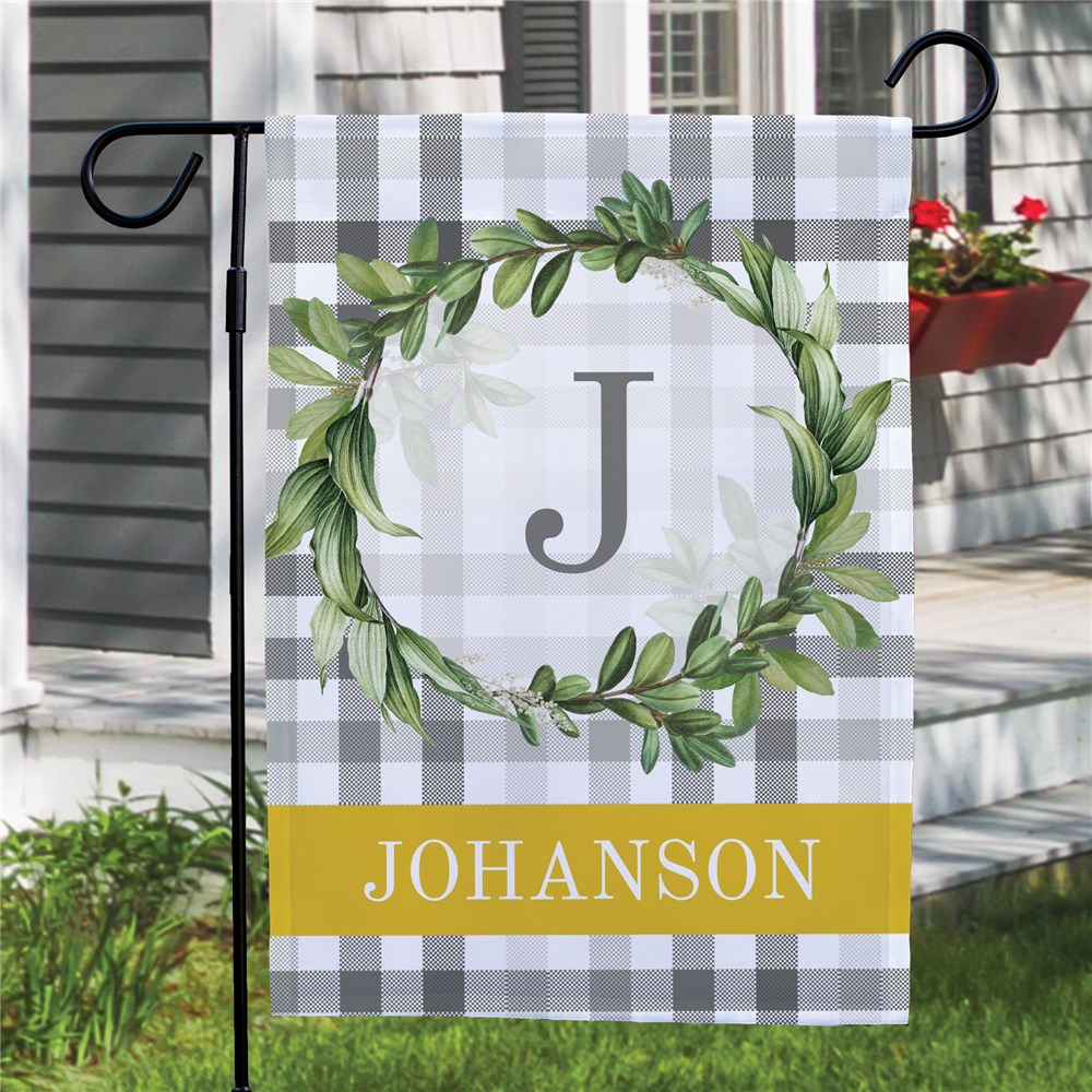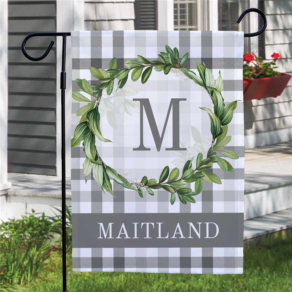 Give your yard a touch up with this stylish Personalized Eucalyptus Wreath on Plaid Garden Flag.