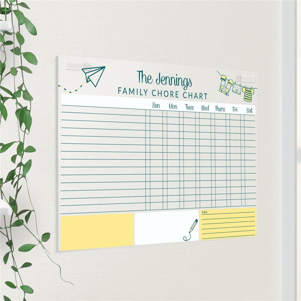 Each family member will know what their responsibilities are for the week with our Personalized Family Chore Chart with Doodles Acrylic Sign.